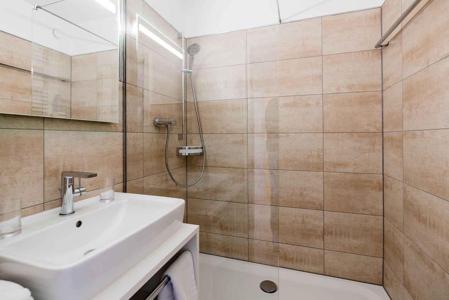 Das Badezimmer beeindruckt durch klare Linien, hochwertige Armaturen und eine ebenerdige Dusche, die Wellnessmomente direkt in der Wohnung ermöglicht.