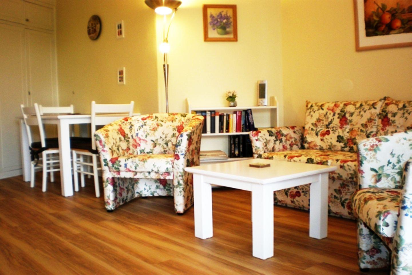 Die ca.?54?m² große 2-Zimmer-Ferienwohnung überzeugt durch eine freundliche Raumaufteilung und eine Einrichtung, die ein angenehmes Urlaubsgefühl schafft. Der helle Wohn- und Essbereich bildet den zentralen Treffpunkt der Wohnung und bietet ausreichend Platz zum Entspannen nach einem Tag am Strand oder an der Promenade. Eine gemütliche Sofaecke lädt zum Lesen oder Fernsehen ein, während der Essbereich Raum für gemeinsame Mahlzeiten bietet.