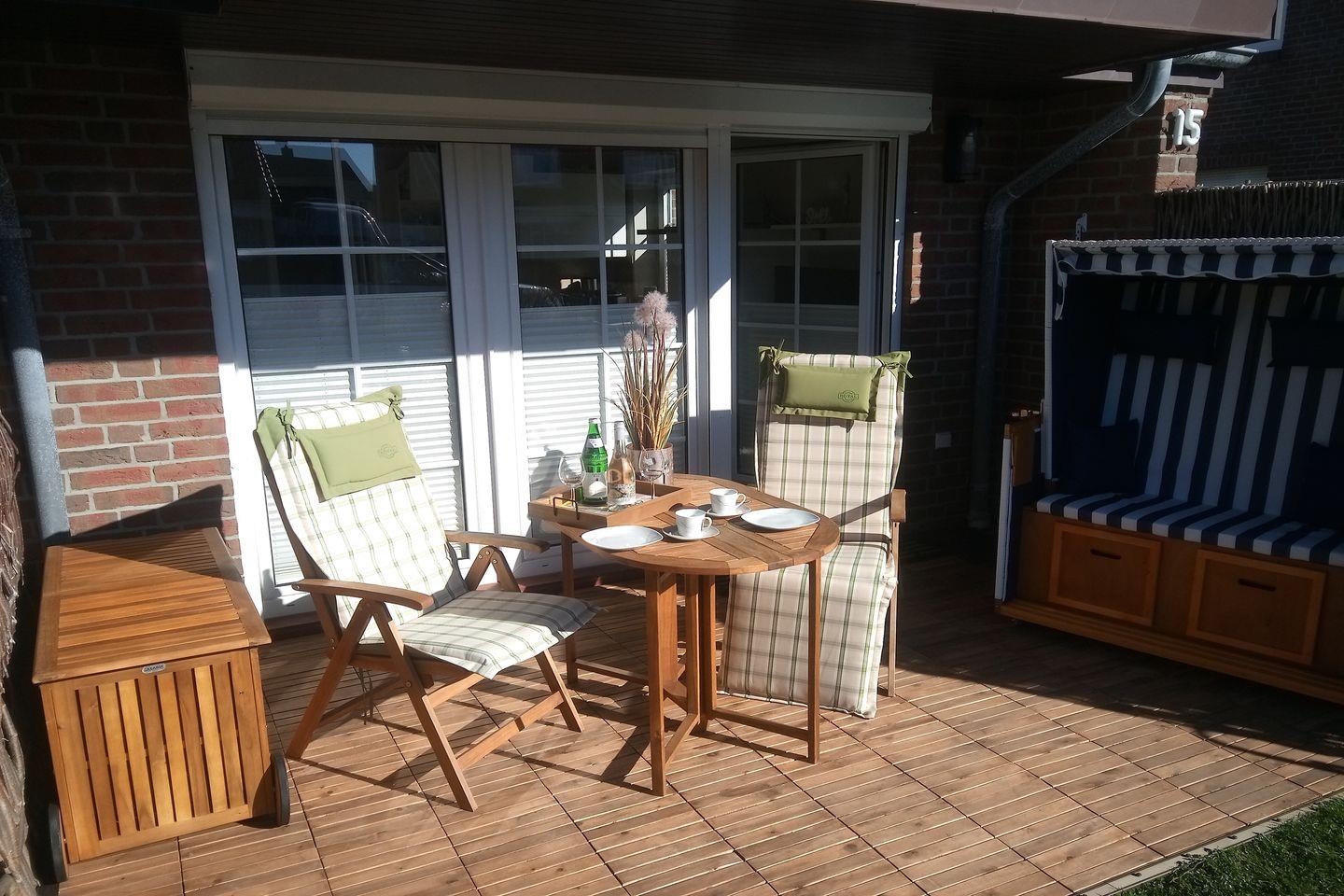 Ein besonderes Highlight ist die sonnige, windgeschützte Terrasse mit Sitzgelegenheiten, auf der Sie die frische Sylter Meeresluft genießen können – perfekt für ein entspanntes Frühstück im Freien oder einen gemütlichen Ausklang des Tages. Ein eigener Parkplatz sowie Fahrradabstellmöglichkeiten hinter dem Haus stehen ebenfalls zur Verfügung.