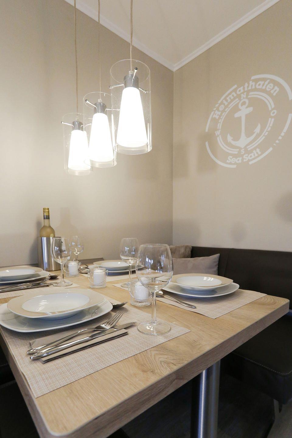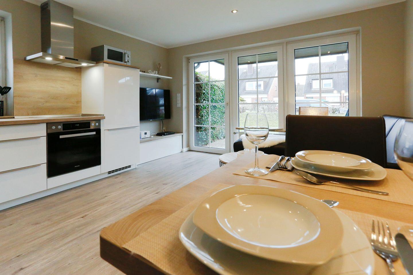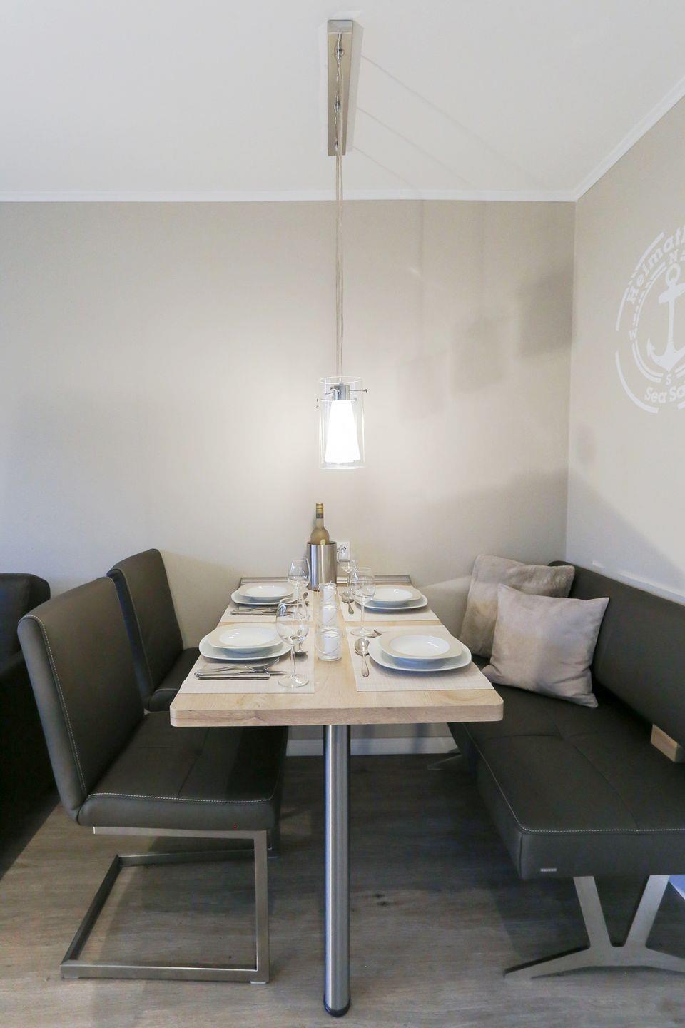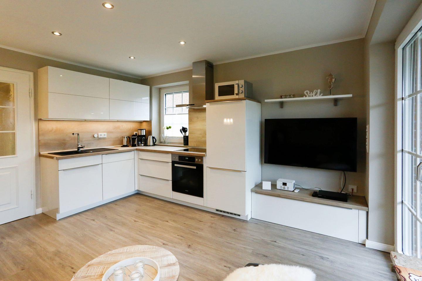 Der helle Wohnbereich mit integrierter Küche bildet das Herzstück der Wohnung. Große Fenster sorgen für viel Tageslicht und eine freundliche Atmosphäre. Die neue, vollständig ausgestattete Küche verfügt unter anderem über ein Cerankochfeld, einen Backofen, eine Kühl-Gefrierkombination, einen Geschirrspüler sowie eine Nespresso- und Filterkaffeemaschine, einen Milchaufschäumer und Wasserkocher – ideal für einen komfortablen Aufenthalt. Ein gemütlicher Essbereich mit Lederbank und Stühlen für bis zu vier Personen lädt zu gemeinsamen Mahlzeiten ein.