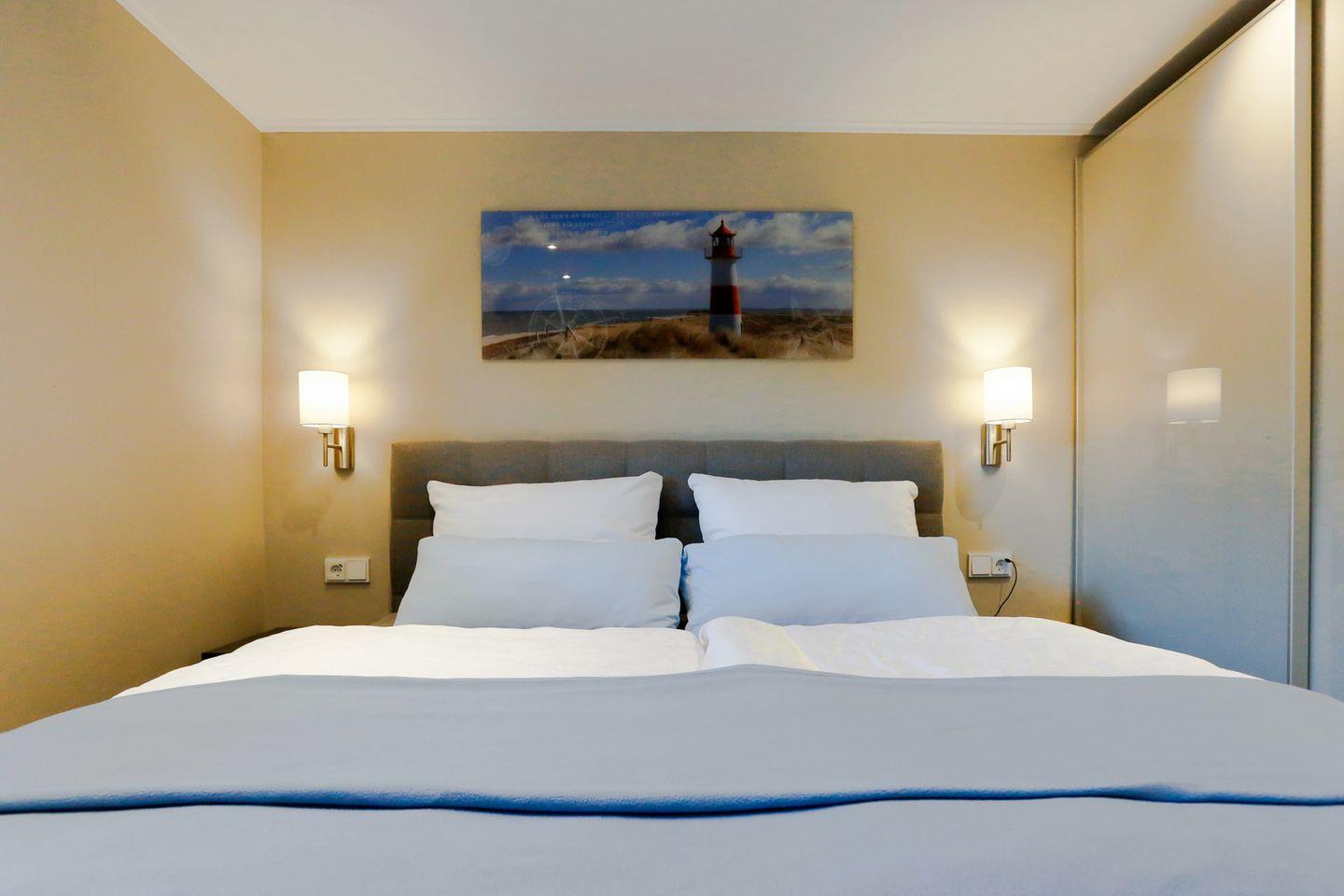 Das separate Schlafzimmer ist mit einem hochwertigen Boxspringbett (180 cm) mit Gel-Topper, einem großzügigen Schwebetürenschrank und einem weiteren Flatscreen-TV ausgestattet und bietet beste Voraussetzungen für erholsame Nächte.