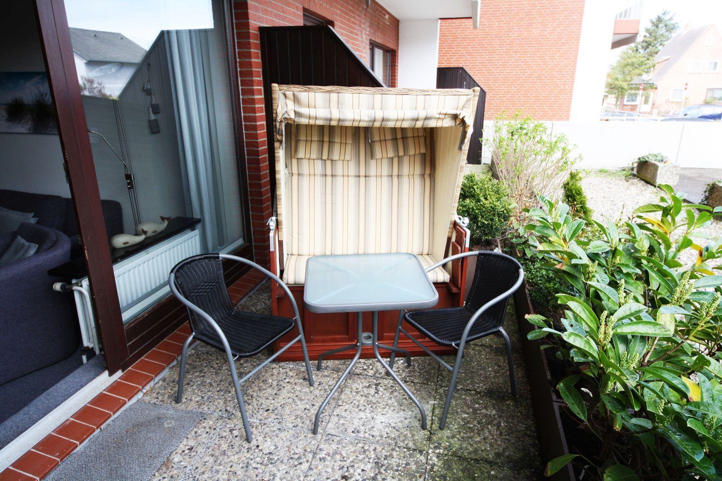 Ein besonderes Plus ist die möblierte Terrasse in Ostausrichtung, auf der Sie den Tag entspannt mit einem Frühstück an der frischen Nordseeluft beginnen können.