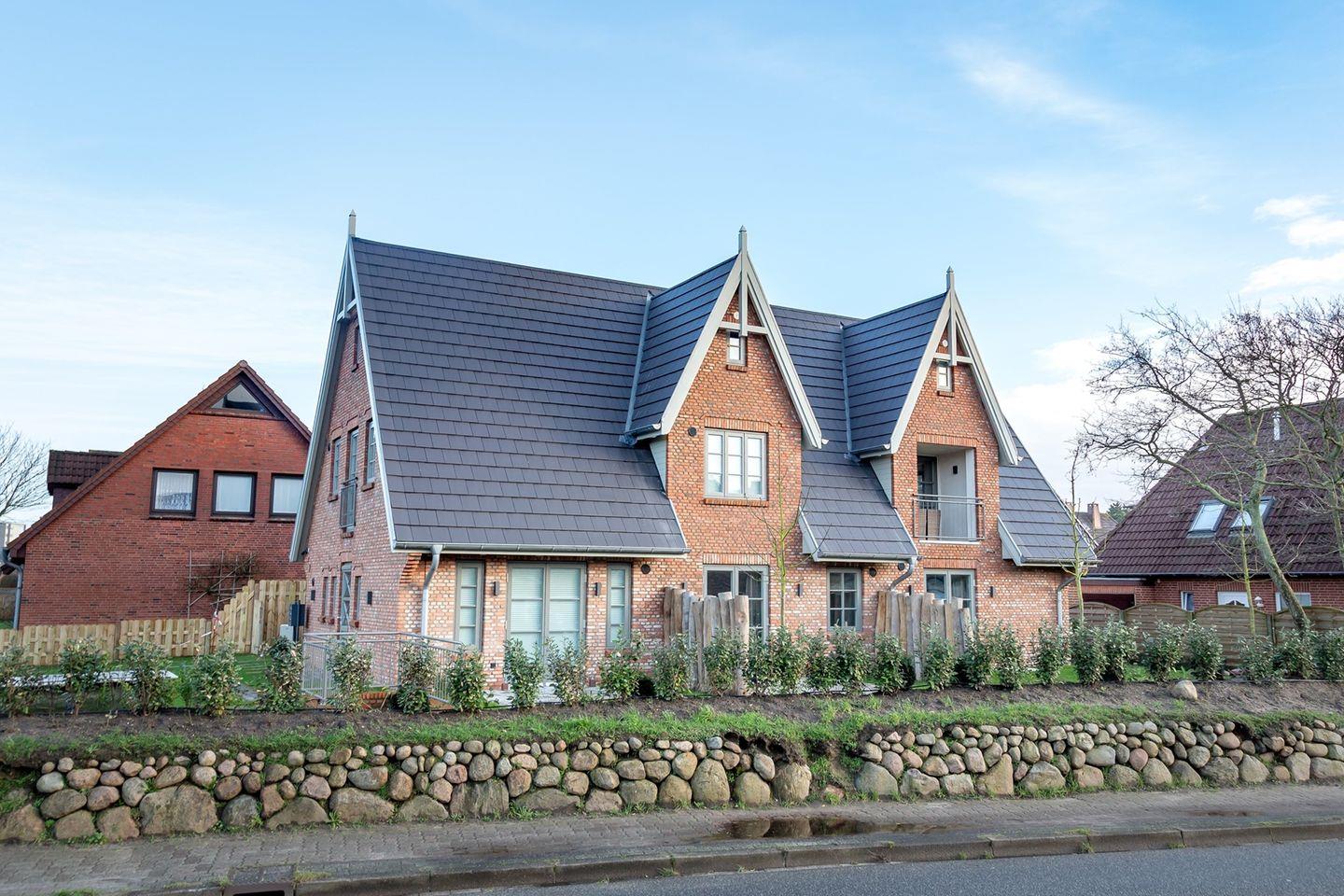 Der inseltypische Friesenwall mit seiner Bepflanzung zieht sich rund um das Haus herum.