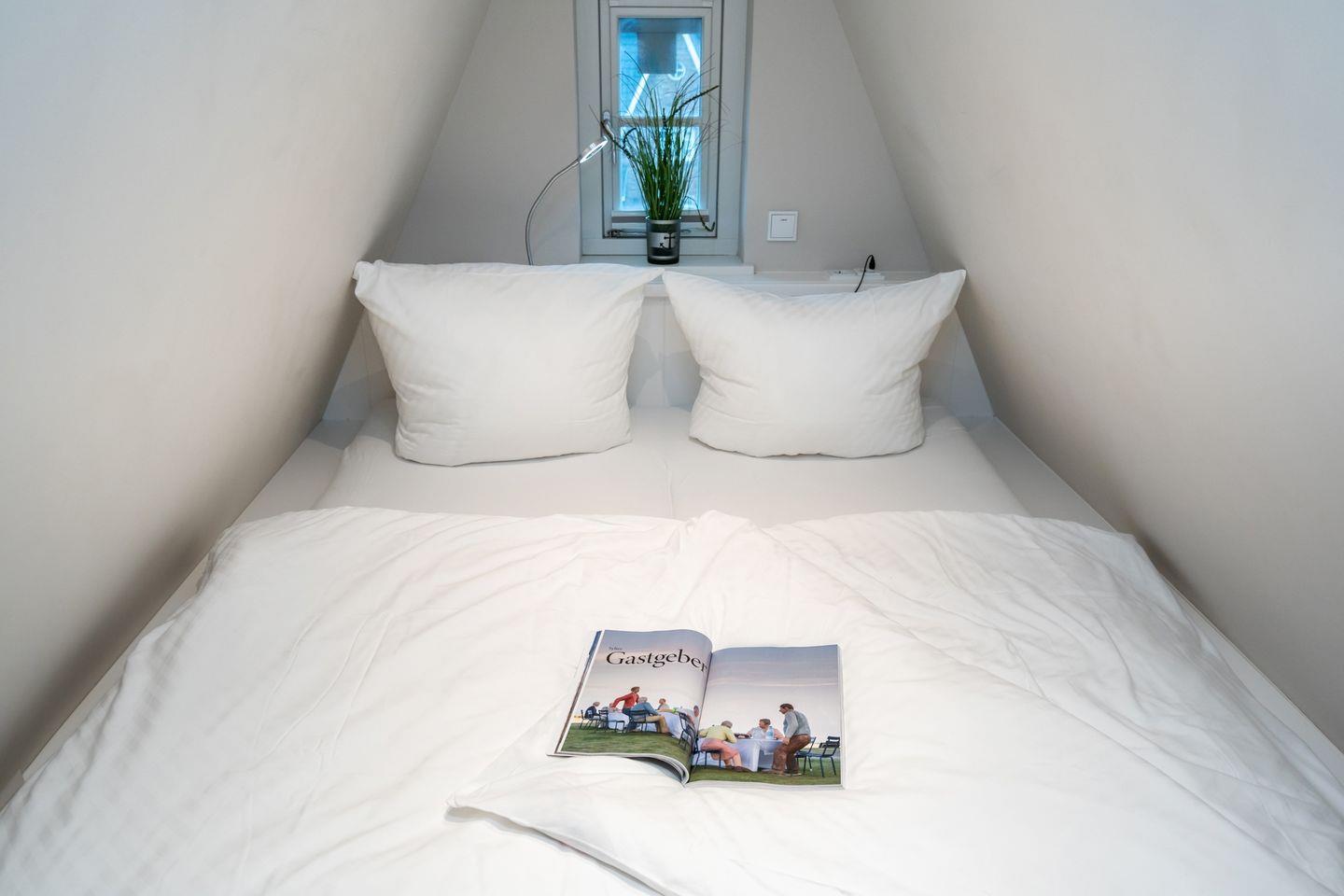 Im 2.OG befinden sich das Schlafzimmer und das Gäste-WC. Das Hauptschlafzimmer ist eine Wohlfühloase mit Doppelbett, so genannte Kojen und Flat-TV. Das weitere, sehr bequeme Doppelbett, ebenfalls Kojenart, grenzt direkt an das Hauptschlafzimmer an. Es handelt sich also um keinen separaten Raum. Holzböden schaffen in den Schlafbereichen Natürlichkeit und Wärme.