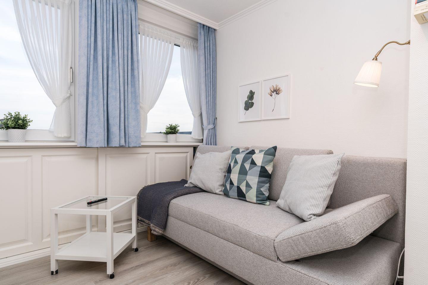 Hier wurde aus jedem Winkel das Beste herausgeholt und so ist ein hyggeliges Wohlfühldomizil entstanden. Der in frischen Farben gehaltene Wohn- und Schlafbereich punktet mit einer hochwertigen Couch, die sich ruckzuck in ein bequemes Doppelbett (Liegefläche 1,50m) verwandeln lässt. Die Pantryküche ist bestens ausgestattet und auch in dem modernen Duschbad fehlt es an nichts. Das perfekte kleine Nest für eine Auszeit auf Sylt!