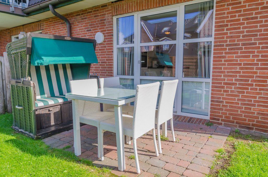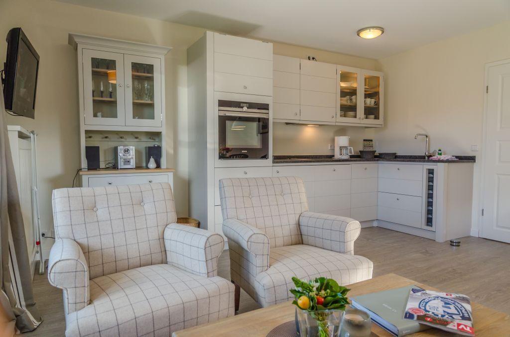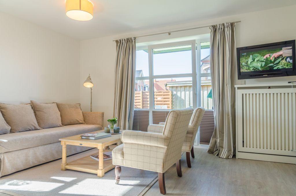 Das stilvoll eingerichtete Wohnzimmer verfügt über ein ausziehbares Schlafsofa (140x200 cm), zwei bequeme Sessel, einen TV und einen Esstisch für 4 Personen. Von hier aus haben Sie direkten Zugang zur möblierten West-Terrasse mit Strandkorb – perfekt, um die Nachmittagssonne zu genießen.