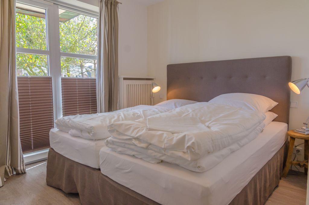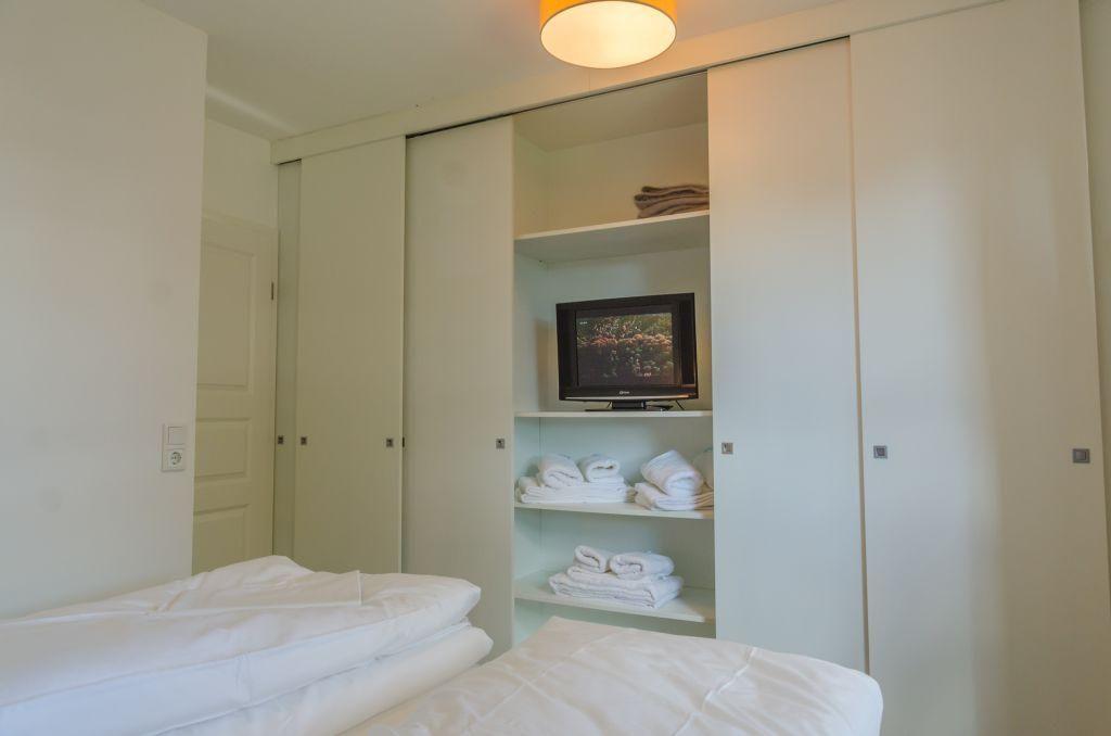Das Schlafzimmer ist mit einem Doppelbett (2x 90x200 cm), einem TV und einem Einbauschrank ausgestattet. Es bietet direkten Zugang zur zweiten Terrasse, die nach Osten ausgerichtet ist und sich ideal für ein Frühstück im Freien eignet.