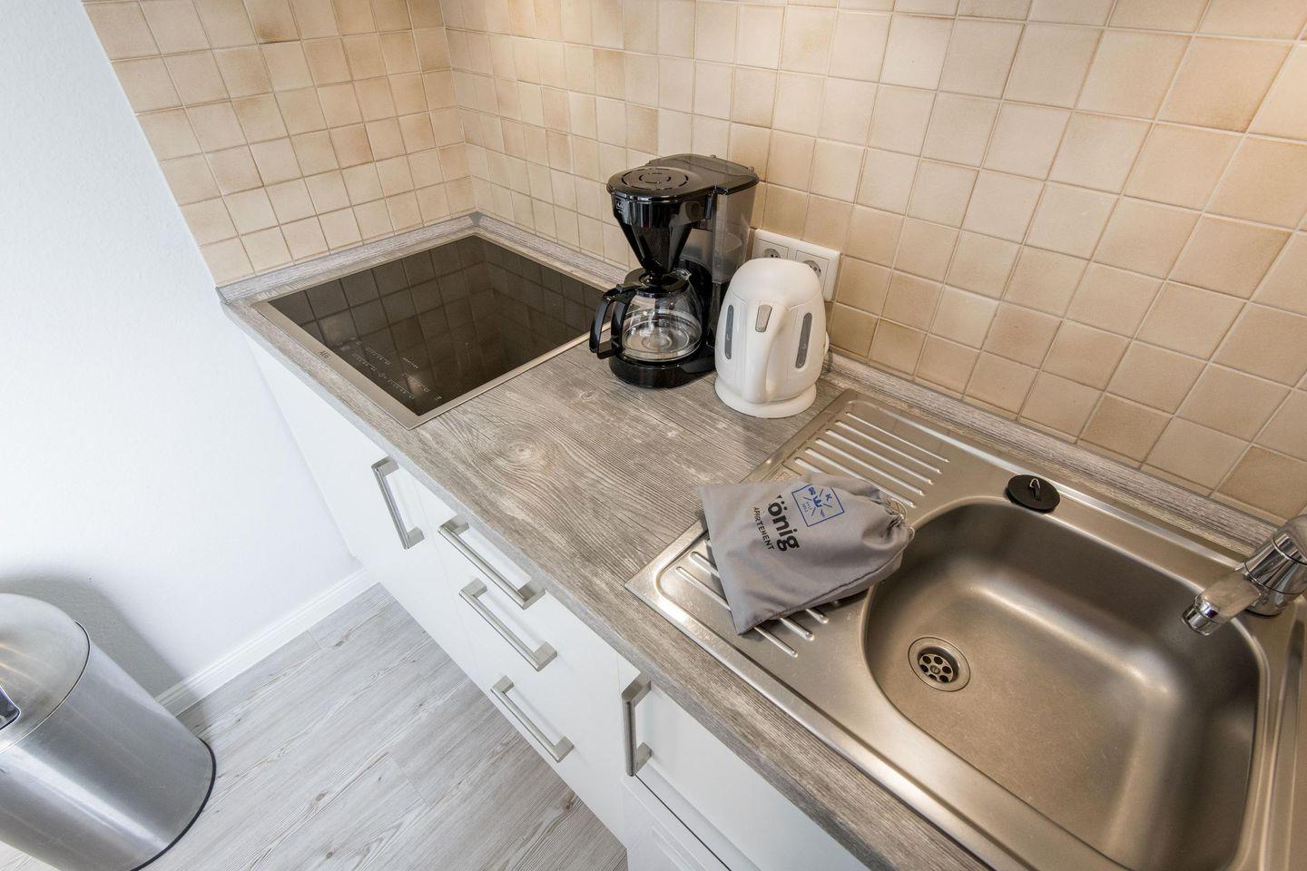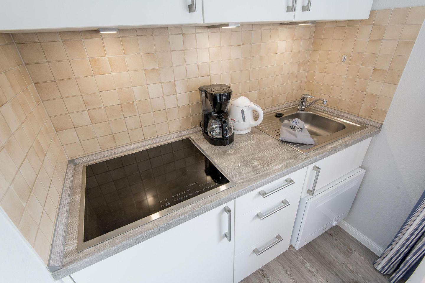 Die offene Küche bietet einen Induktionskochfeld, einen Geschirrspüler und eine Essecke mit Tisch und Stühlen – alles, was Sie für eine bequeme Selbstverpflegung benötigen.