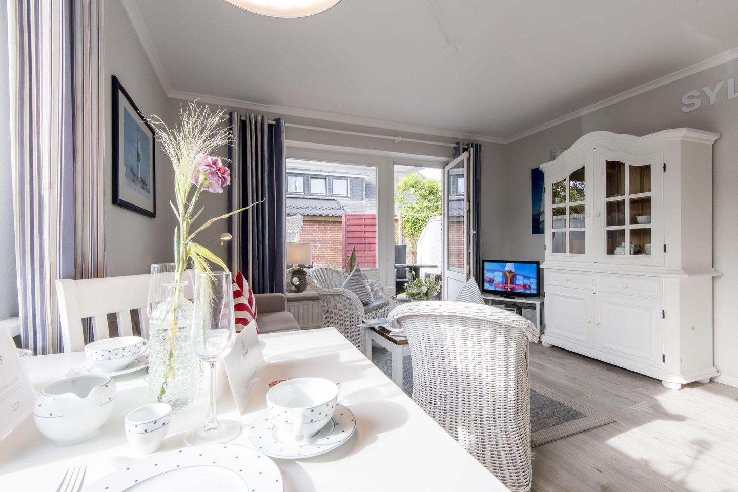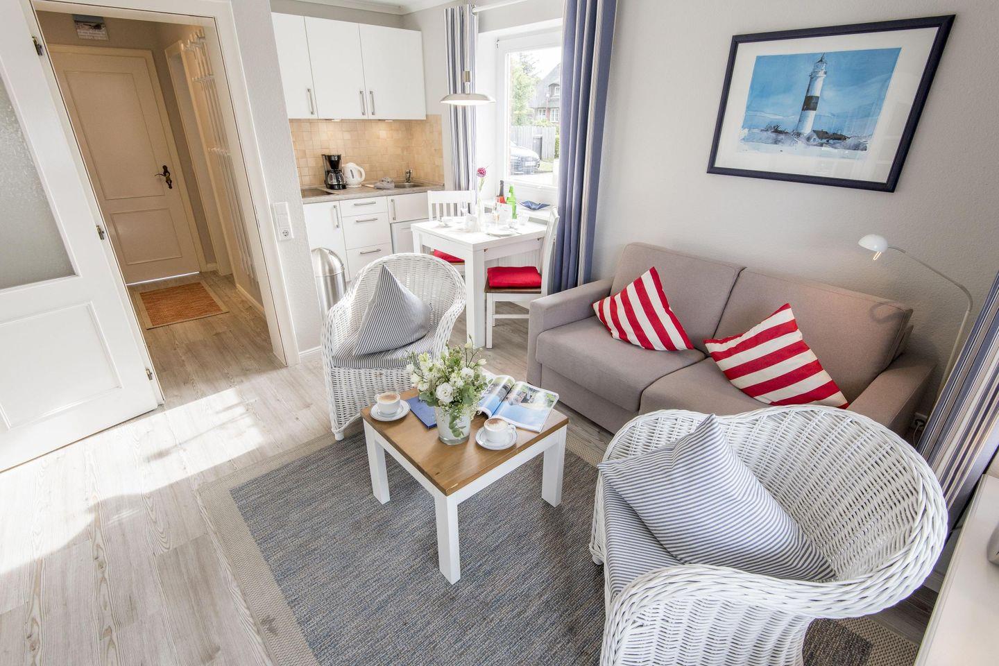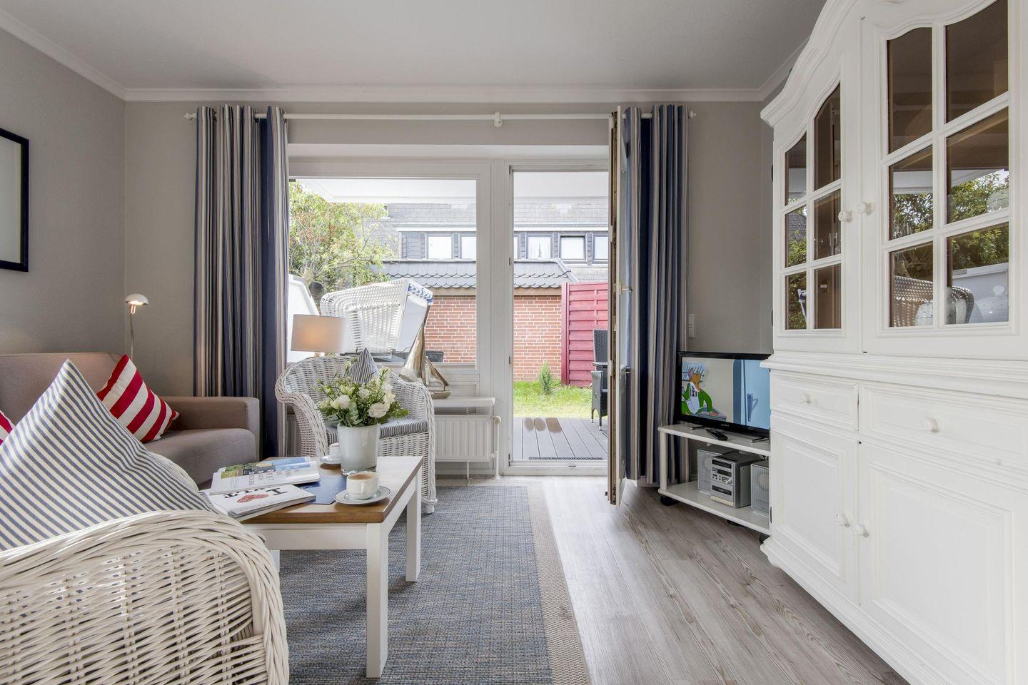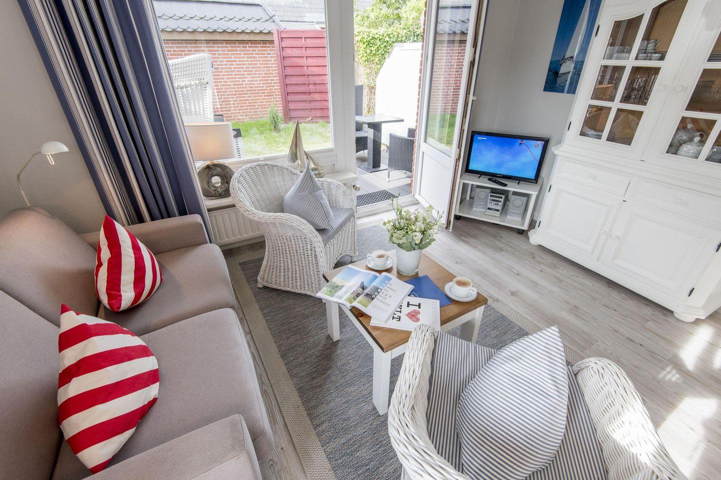 Das gemütliche Wohnzimmer ist mit einem ausziehbaren Schlafsofa (130x200 cm), zwei Korbsesseln und einem TV ausgestattet. Der Zugang zur möblierten Süd-Terrasse führt Sie in einen kleinen Gartenbereich mit einem Saison-Strandkorb (verfügbar von April bis September).