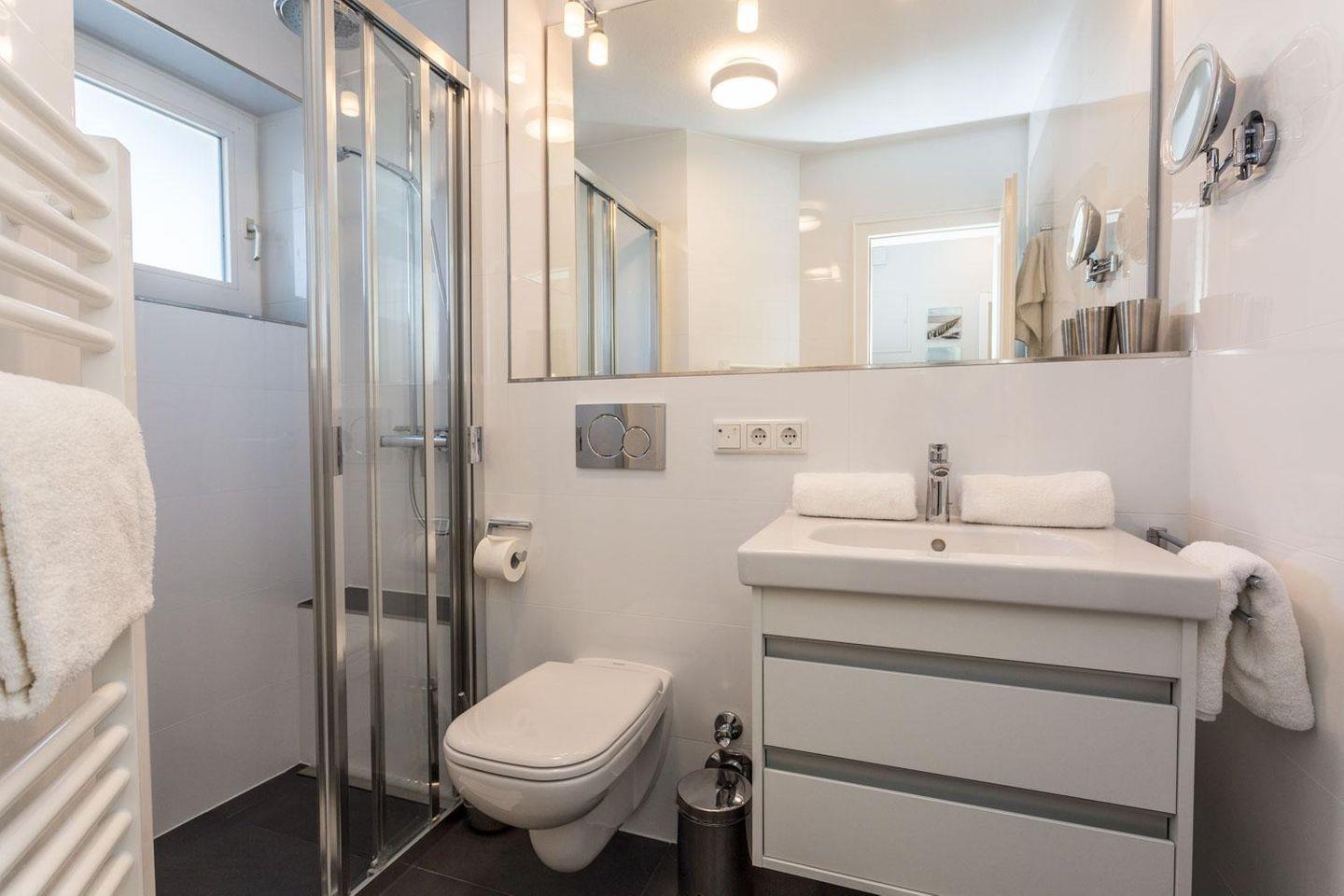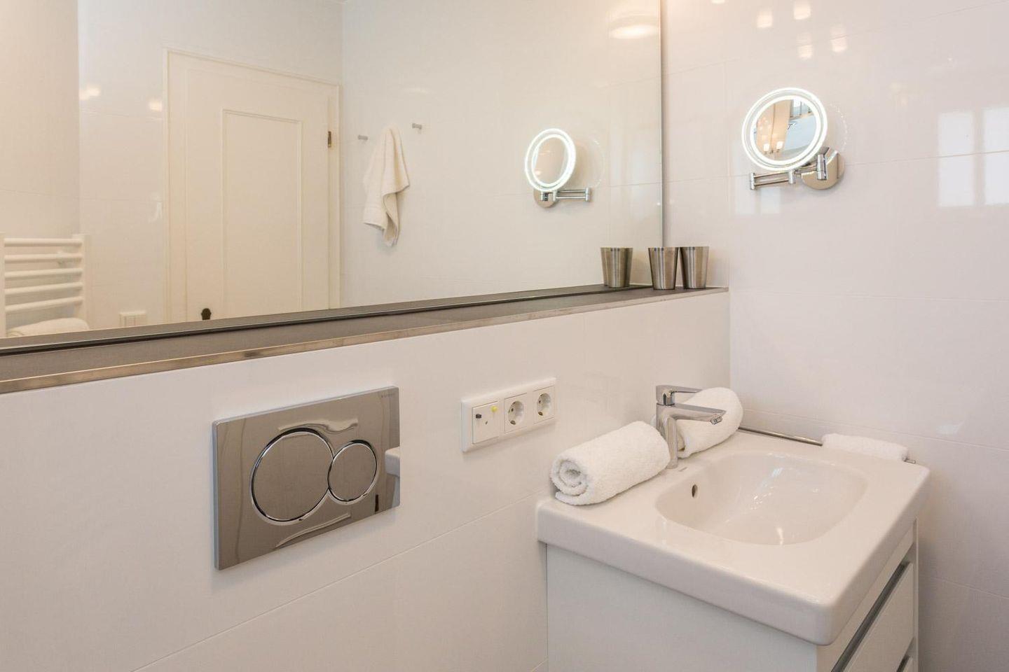 Das Badezimmer ist mit einer Regendusche, einem WC, einem Handtuchwärmer, einem Kosmetikspiegel und Tageslicht ausgestattet.