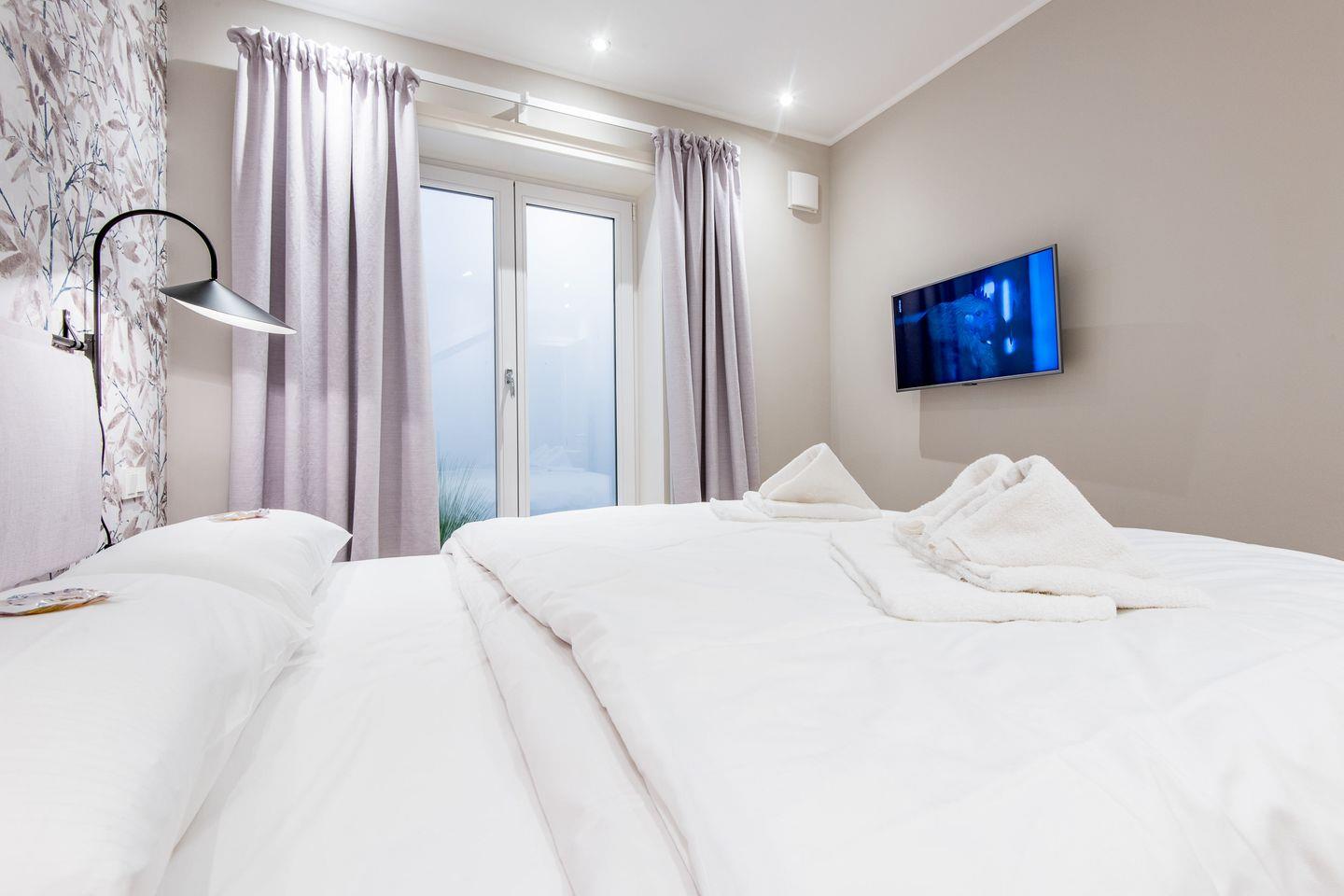 Das Hauptschlafzimmer verfügt über ein großes Boxspringbett (180x200 cm) und einen TV – perfekt für erholsame Nächte. Auch das zweite Schlafzimmer ist mit einem Boxspringbett (180x200 cm) ausgestattet und bietet komfortablen Schlafplatz.
