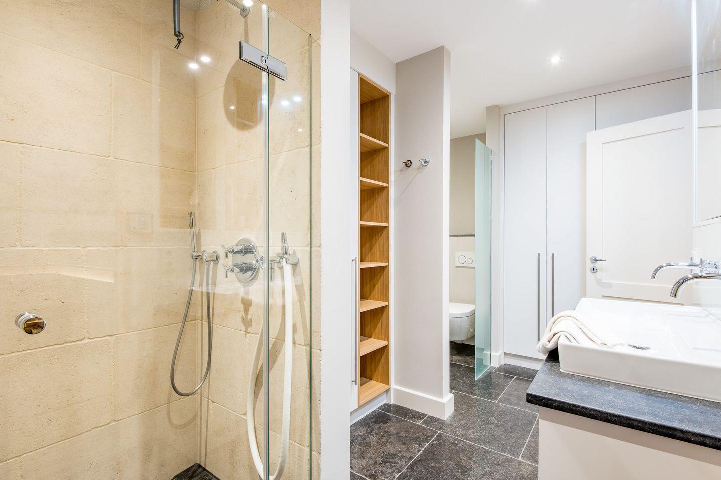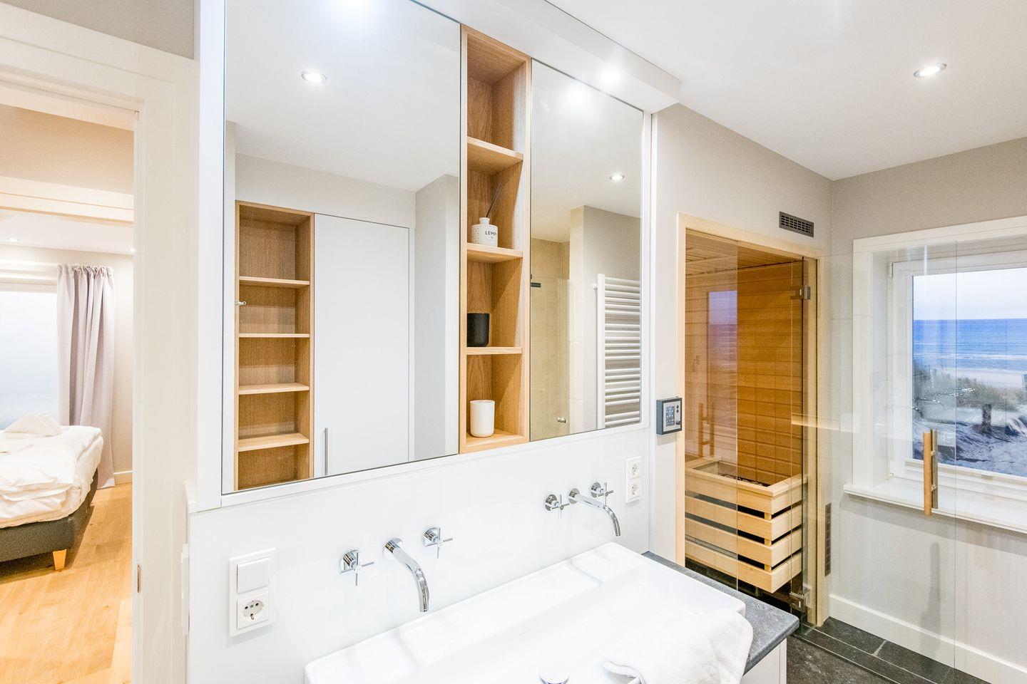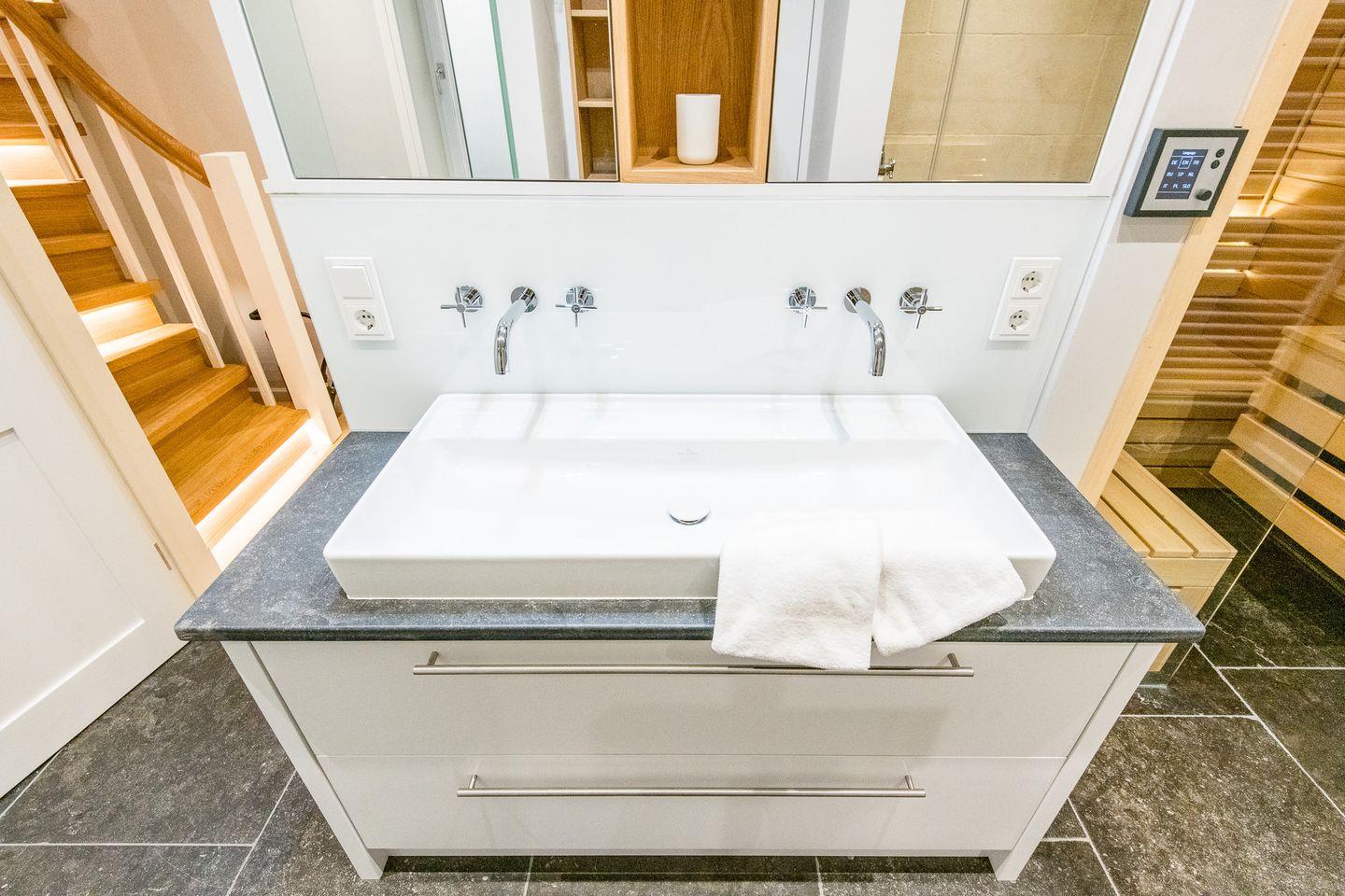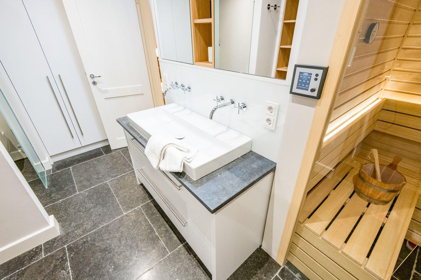 Das moderne Badezimmer ist ein wahres Highlight: Ausgestattet mit einer großzügigen Dusche, WC, Handtuchwärmer und Föhn, sorgt es für einen gelungenen Start in den Tag. Zusätzlich erwartet Sie ein privater Wellnessbereich mit Sauna und Dampfdusche, die Entspannung nach einem Tag am Strand garantieren. Ein separates Gäste-WC ist ebenfalls vorhanden.