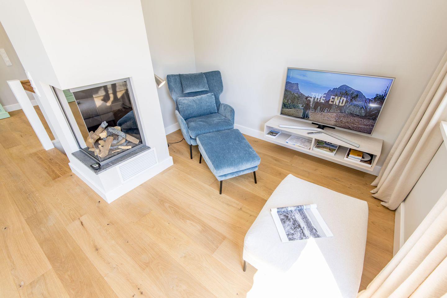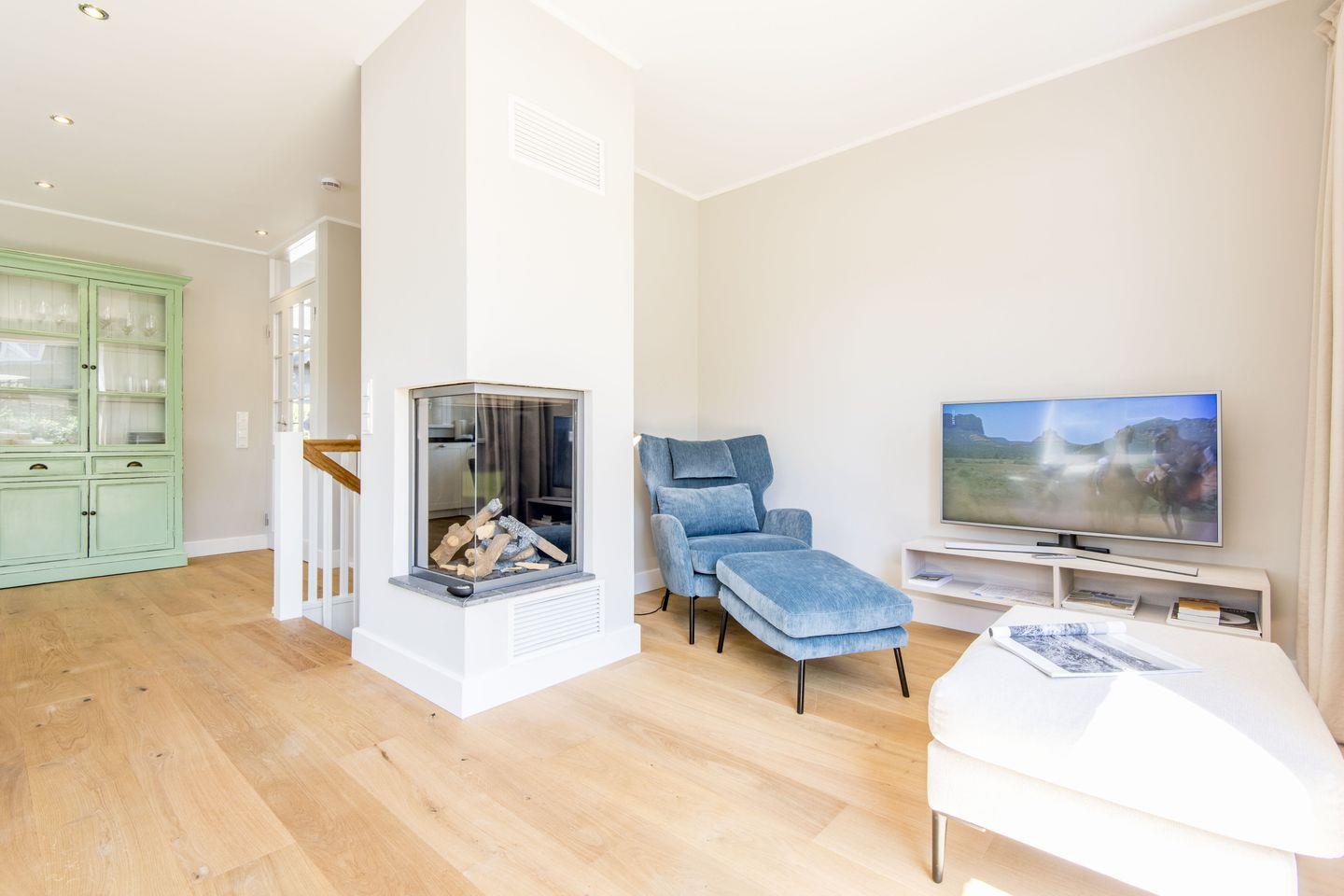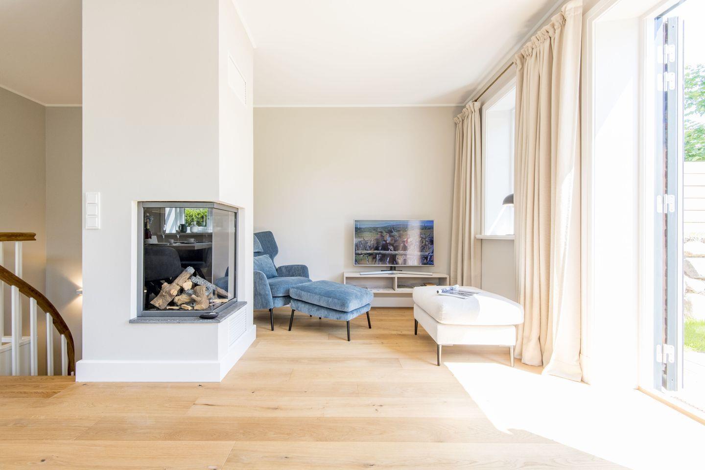 Der lichtdurchflutete Wohnbereich ist mit einem komfortablen Sofa und TV ausgestattet. Einladend und gemütlich bietet der Essbereich Platz für gemeinsame Mahlzeiten. Der moderne Gaskamin verleiht dem Raum an kühlen Abenden eine behagliche Atmosphäre. Die sonnige Südterrasse, eingebettet in einen grünen Garten, lädt zum Verweilen und Entspannen im Freien ein.