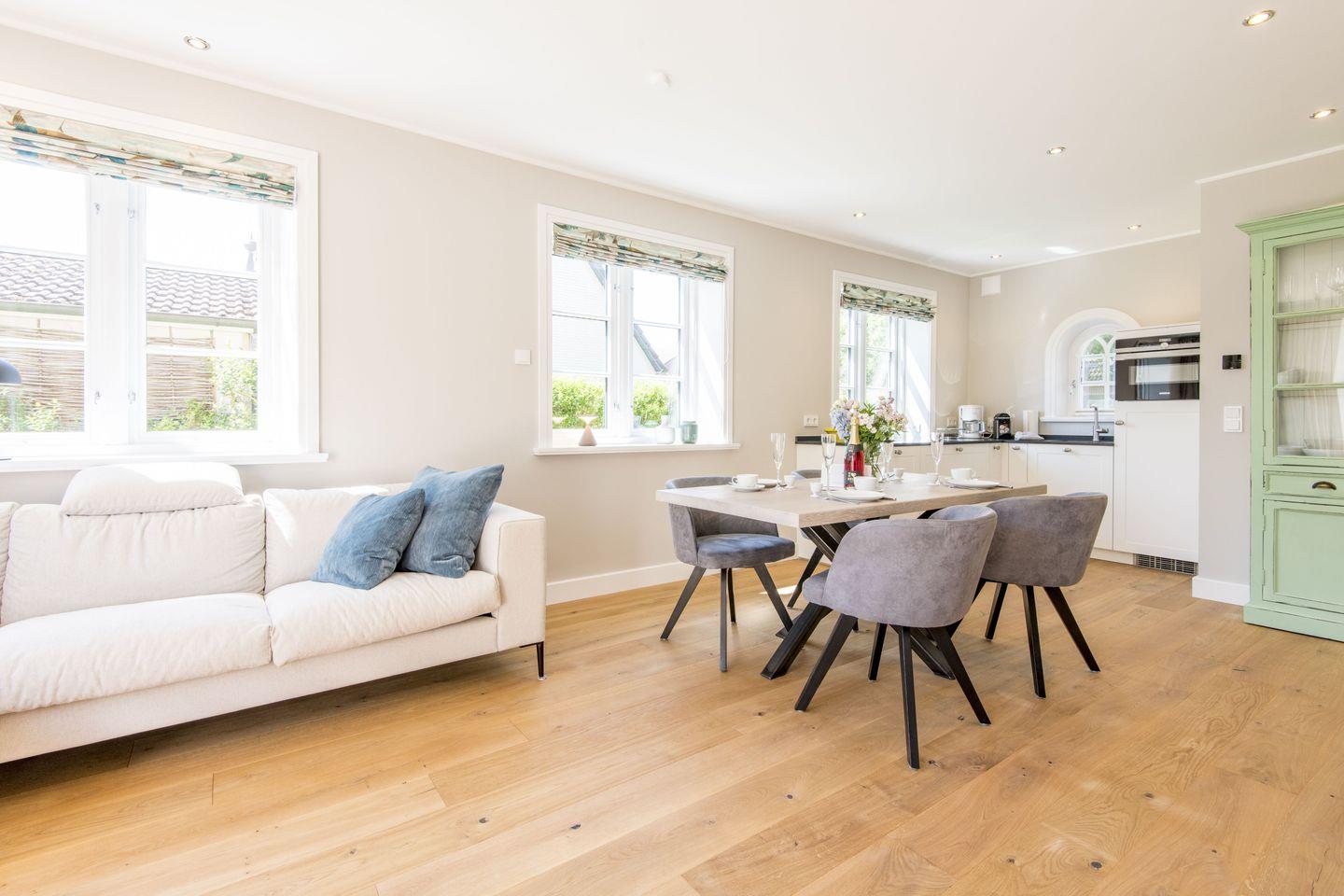 Moderne Ferienwohnung im „Tualighaker Hüs“ auf ca. 90 m² und zwei Ebenen, ideal für bis zu 4 Personen. Diese stilvolle Unterkunft in zentraler Lage von Westerland bietet nicht nur einen kurzen Weg zum Strand, sondern auch ein luxuriöses Wellnessambiente, das Entspannung und Komfort vereint.