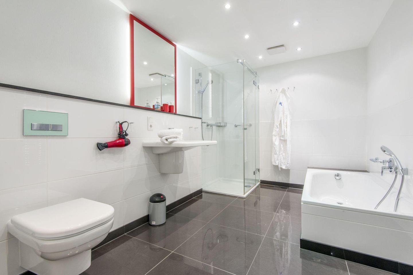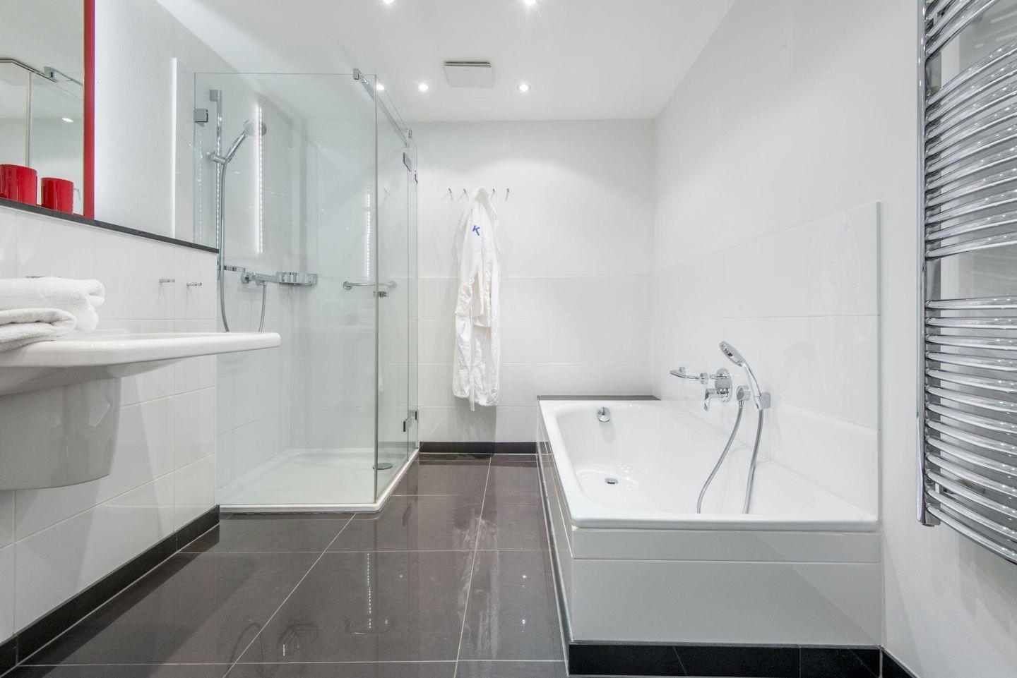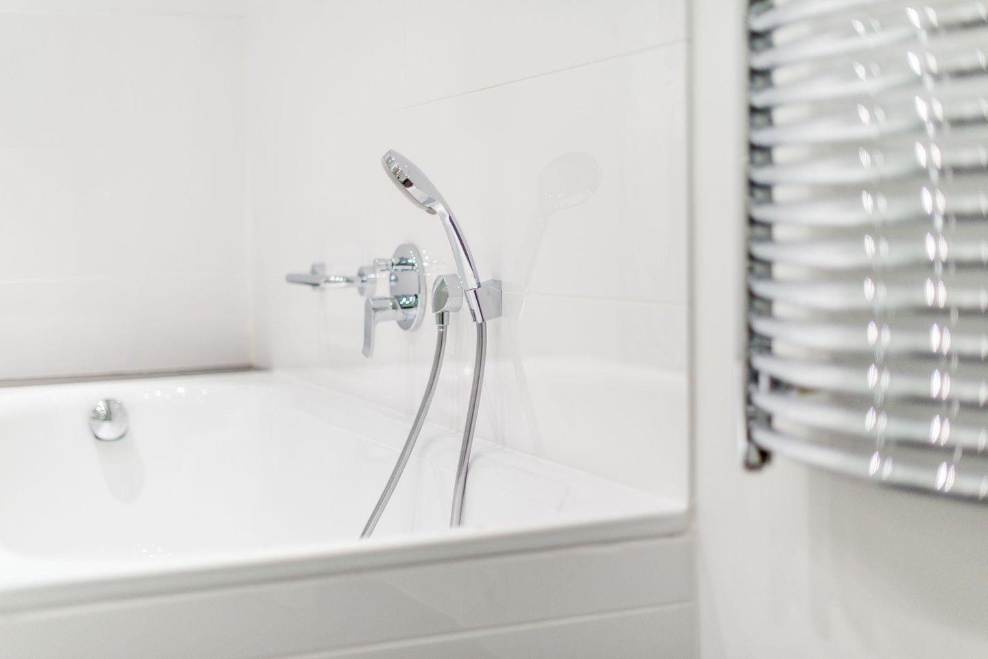 Das große Badezimmer bietet Ihnen eine angenehme Wohlfühlatmosphäre mit einer separaten Dusche, einer Badewanne, einem WC, einem Föhn und einem Handtuchwärmer – perfekt für entspannende Momente nach einem erlebnisreichen Inseltag.