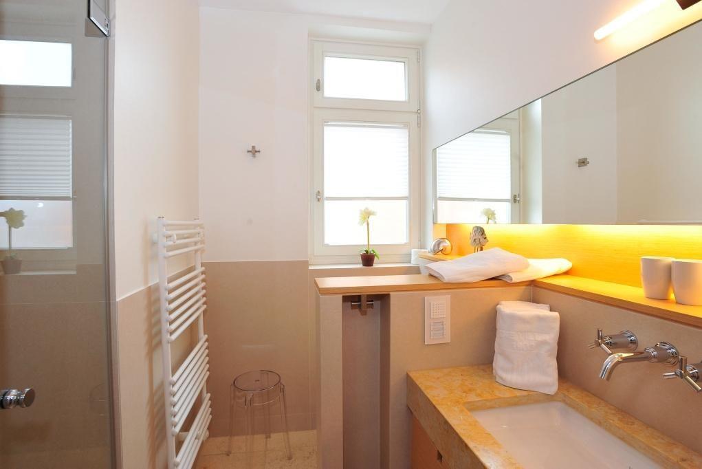 Das erste Badezimmer ist mit einer Badewanne, einem WC, einem Handtuchwärmer und Tageslicht ausgestattet. Der Natursteinfußboden sorgt für eine luxuriöse Atmosphäre. Das zweite Badezimmer verfügt über eine Dusche, ein WC, einen Handtuchwärmer und Tageslicht – ebenfalls mit elegantem Natursteinfußboden.