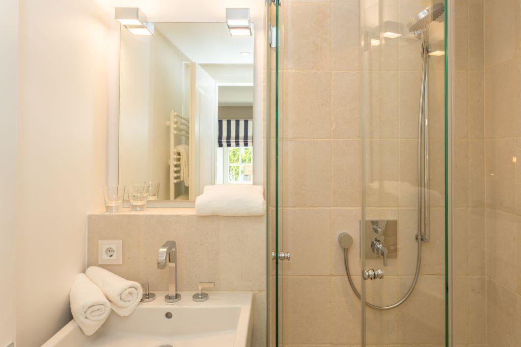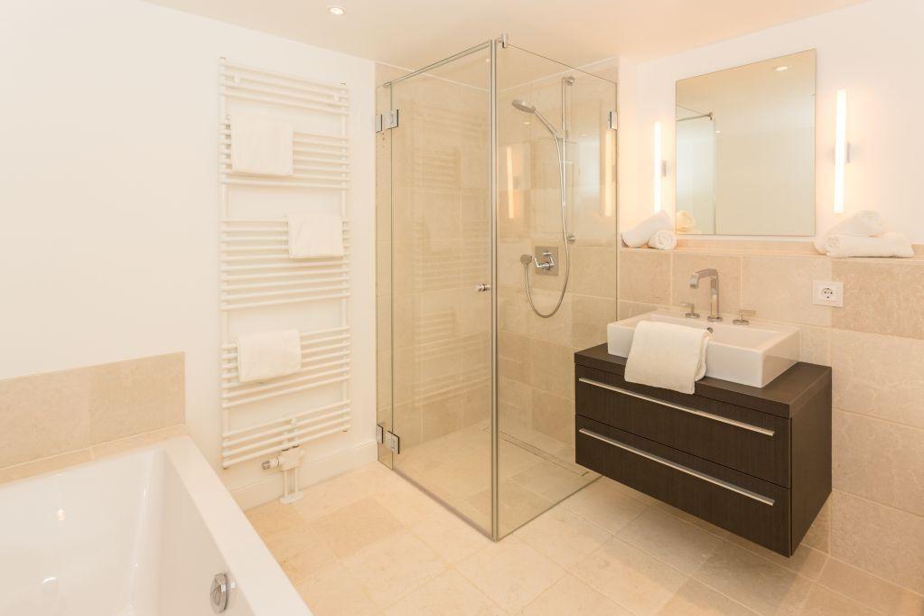 Das erste Badezimmer ist ein Duschbad mit ebenerdiger Dusche, WC, Handtuchwärmer und Föhn. Das zweite Badezimmer ist ein großzügiges Vollbad und bietet eine Badewanne, eine separate ebenerdige Dusche, WC, Handtuchwärmer und Föhn. Ein zusätzliches Gäste-WC steht im Eingangsbereich zur Verfügung.