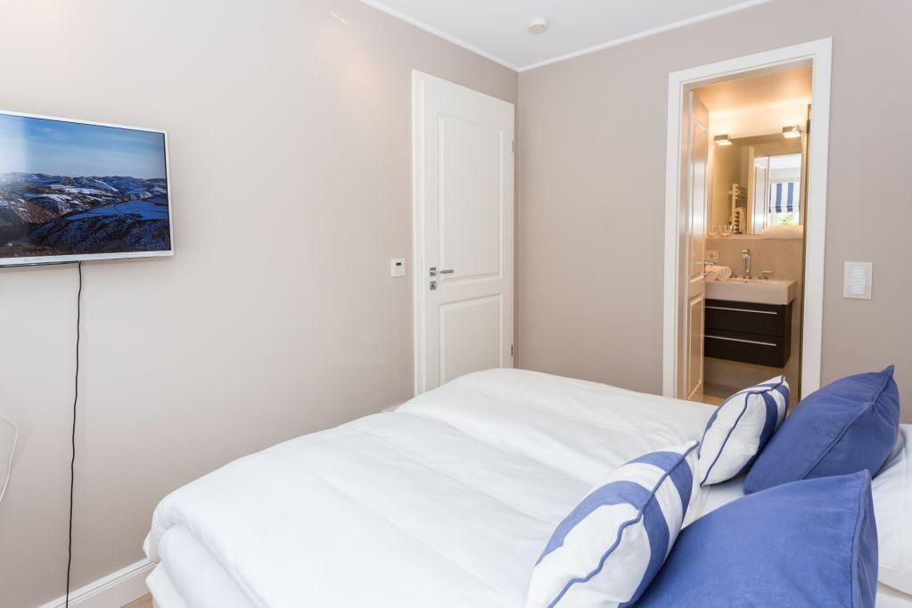 Die Wohnung bietet drei einladende Schlafzimmer, die optimal auf die Bedürfnisse von bis zu 6 Personen zugeschnitten sind. Das erste Schlafzimmer verfügt über ein gemütliches Doppelbett (2x 80x200 cm), stilvolle Einbauschränke, eine Kommode, einen Sessel und einen Fernseher für entspannte Stunden. Im zweiten Schlafzimmer erwartet Sie ebenfalls ein komfortables Doppelbett (2x 80x200 cm), ein Einbauschrank und ein weiterer TV. Das dritte Schlafzimmer ist ebenfalls mit einem Doppelbett (2x 80x200 cm) ausgestattet und verfügt über einen Einbauschrank, einen TV sowie ein eigenes Badezimmer en Suite, welches für zusätzlichen Komfort sorgt.