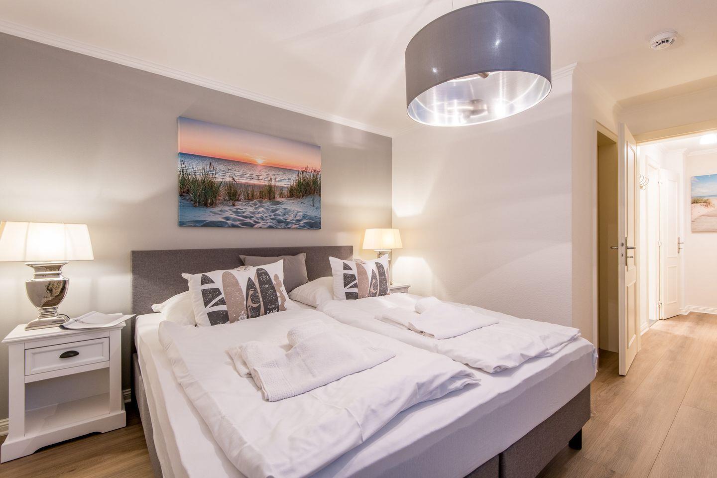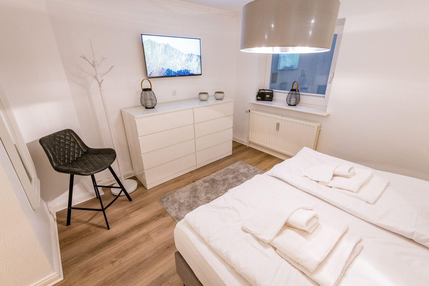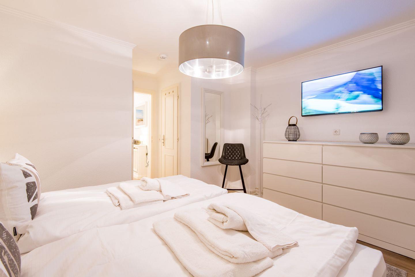 Das Schlafzimmer verfügt über ein Doppelbett (2x 90x200 cm), einen geräumigen Kleiderschrank und einen zusätzlichen TV.
