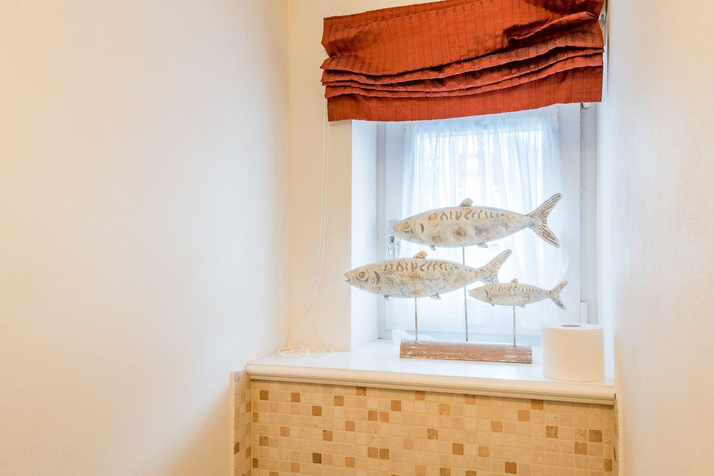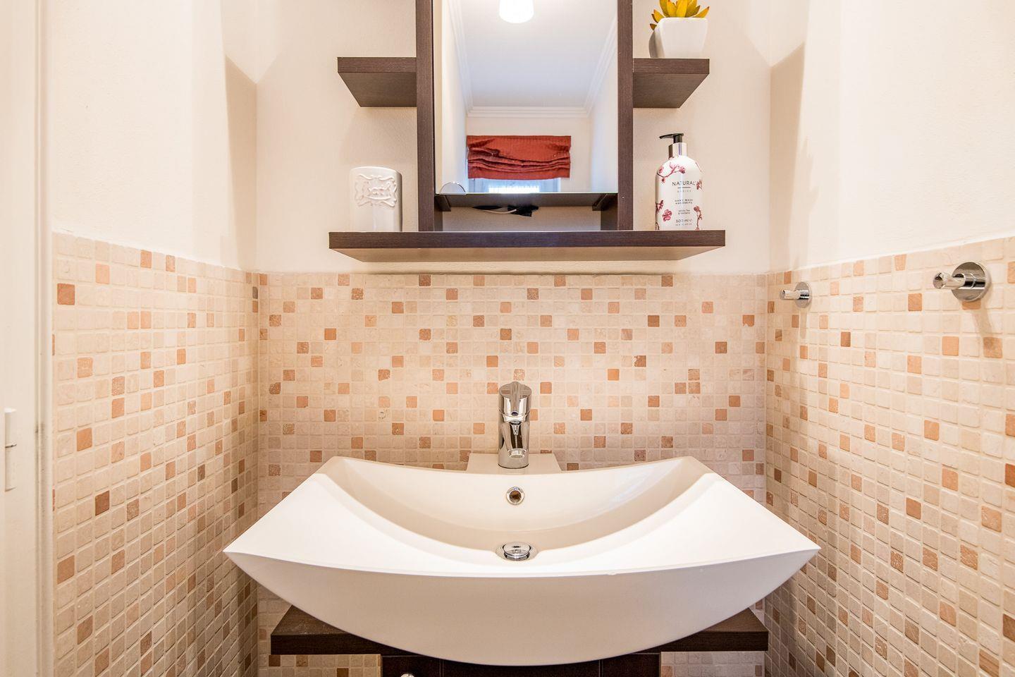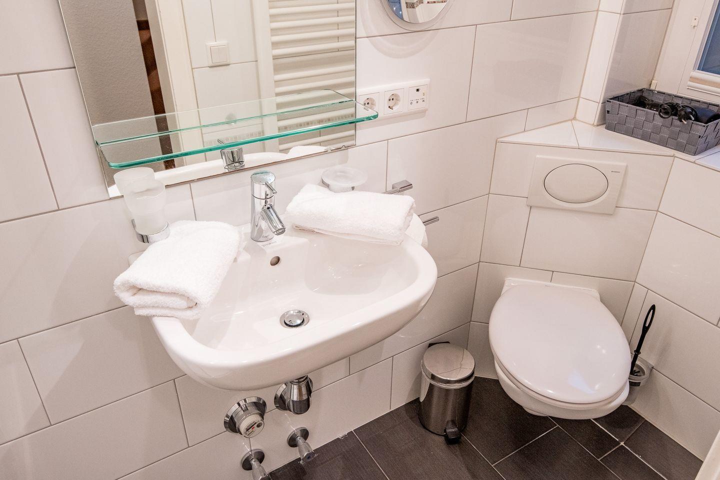 Das Badezimmer ist mit einer Dusche, WC, Tageslicht und einem Föhn ausgestattet. Zusätzlich ist ein Gäste-WC vorhanden.
