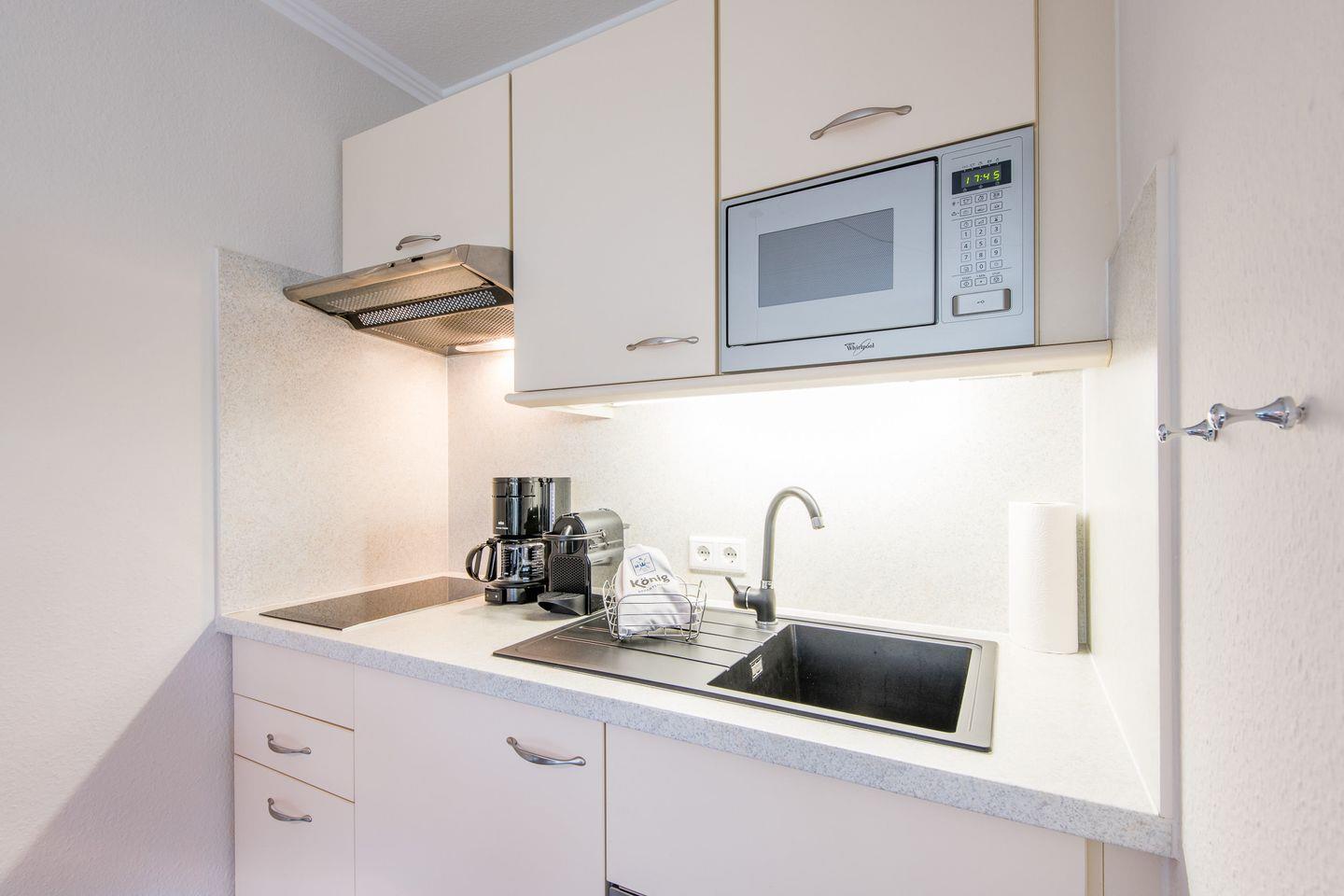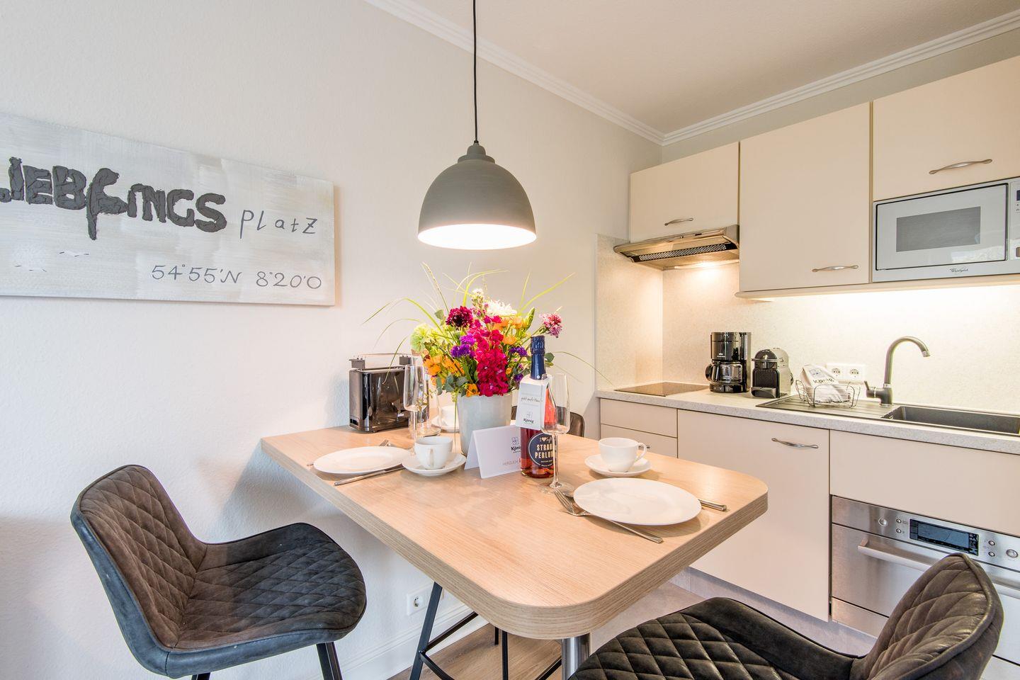 Die offene Küche bietet Ihnen alles, was Sie für eine komfortable Selbstverpflegung benötigen. Sie ist mit einem 2-Platten-Herd, einem kleinen Geschirrspüler und einer Filterkaffeemaschine ausgestattet. Der Essbereich umfasst eine Essgruppe mit drei Stühlen.