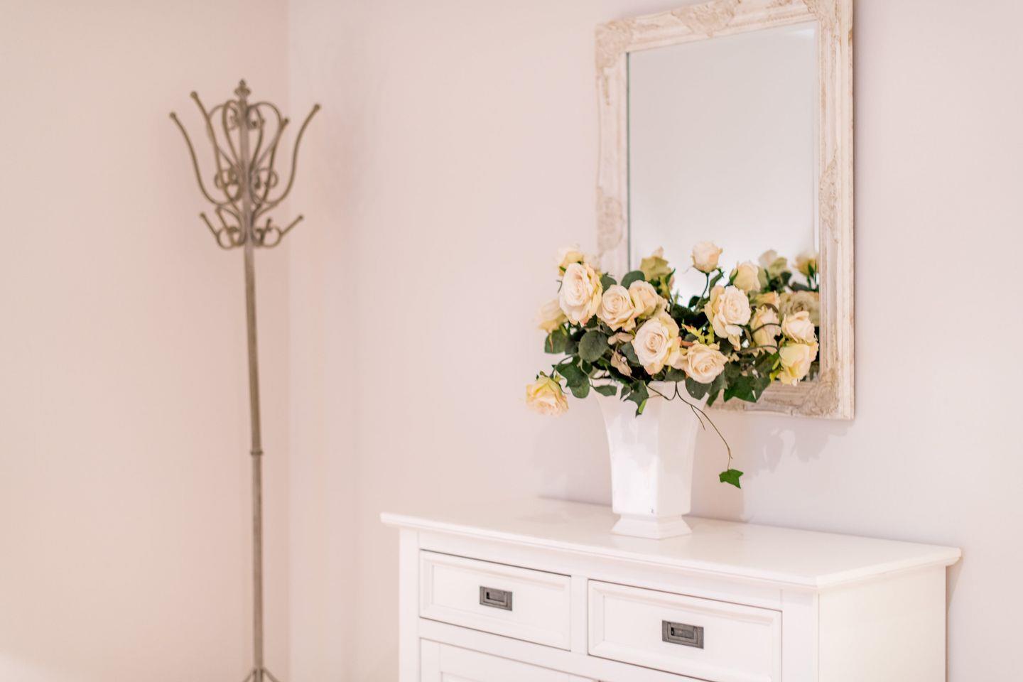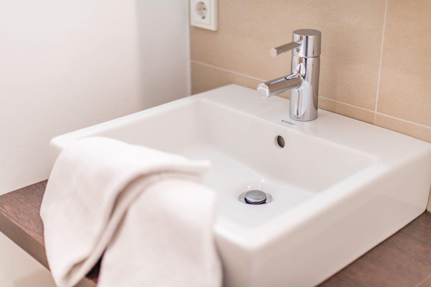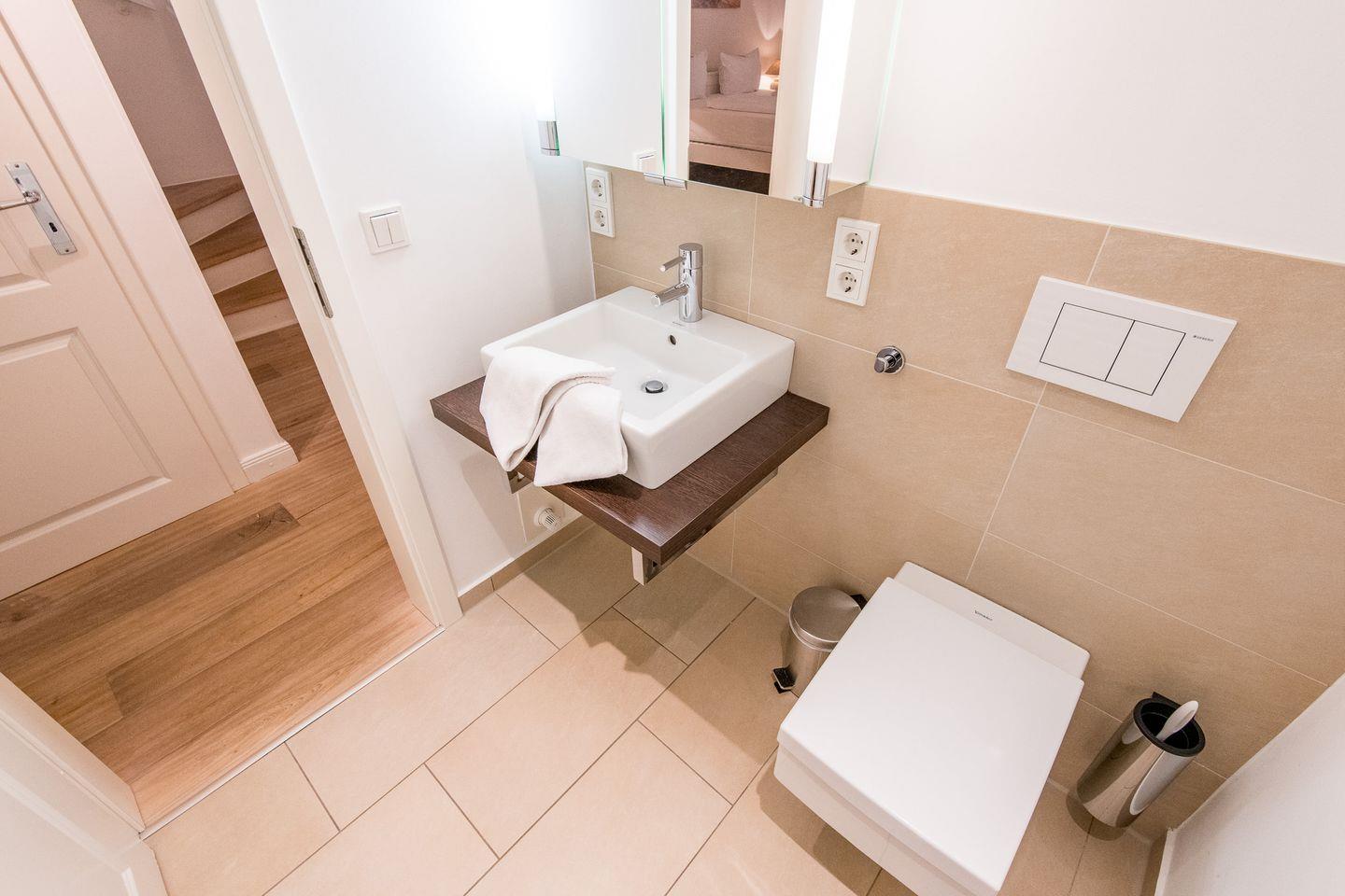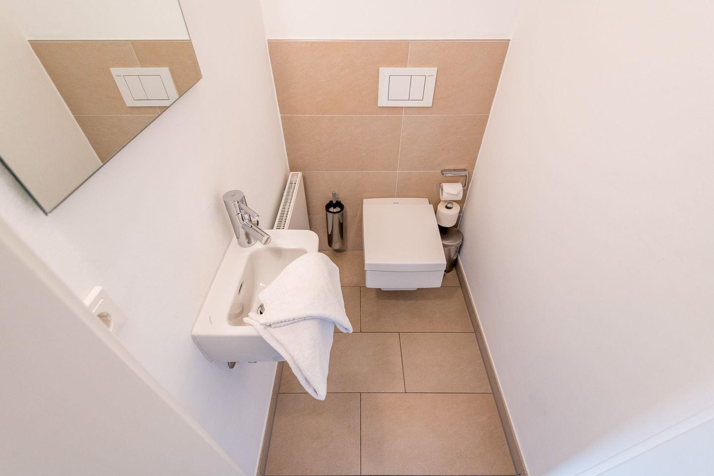 Das moderne Badezimmer ist mit einer ebenerdigen Dusche, WC, Handtuchwärmer und Föhn ausgestattet und bietet ein helles, freundliches Ambiente. Ein zusätzliches Gäste-WC im Eingangsbereich erhöht den Komfort und die Privatsphäre für alle Gäste.
