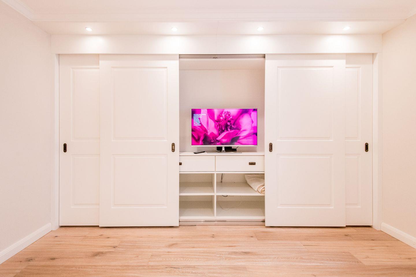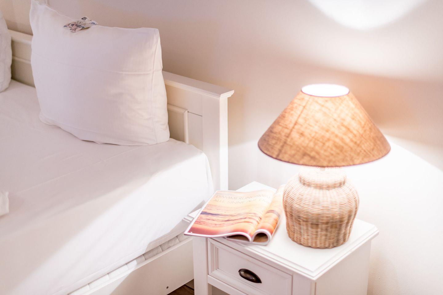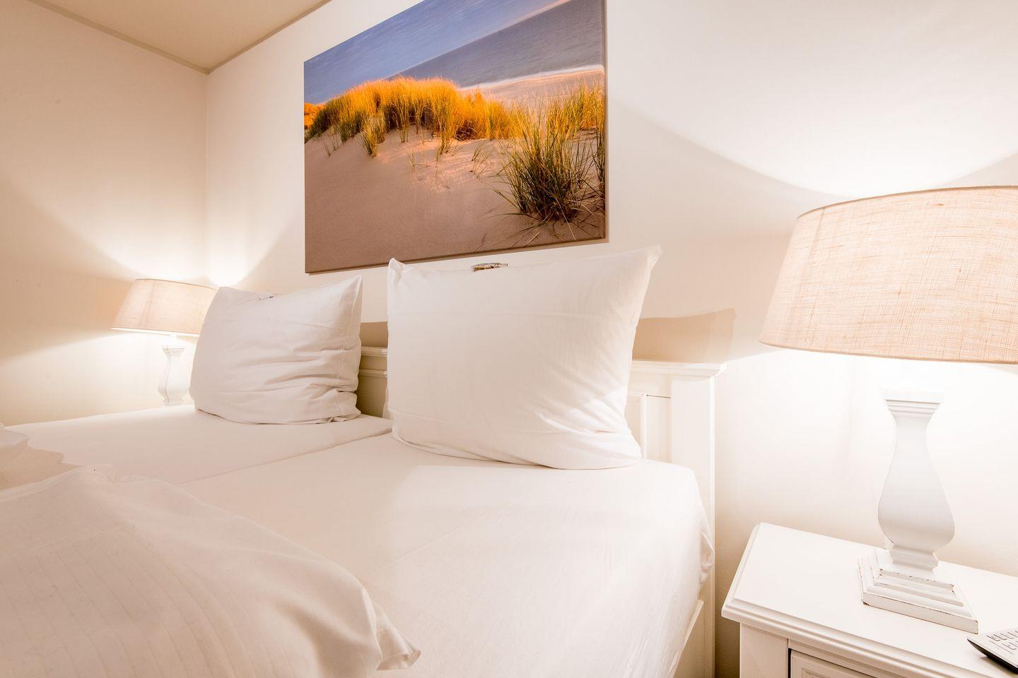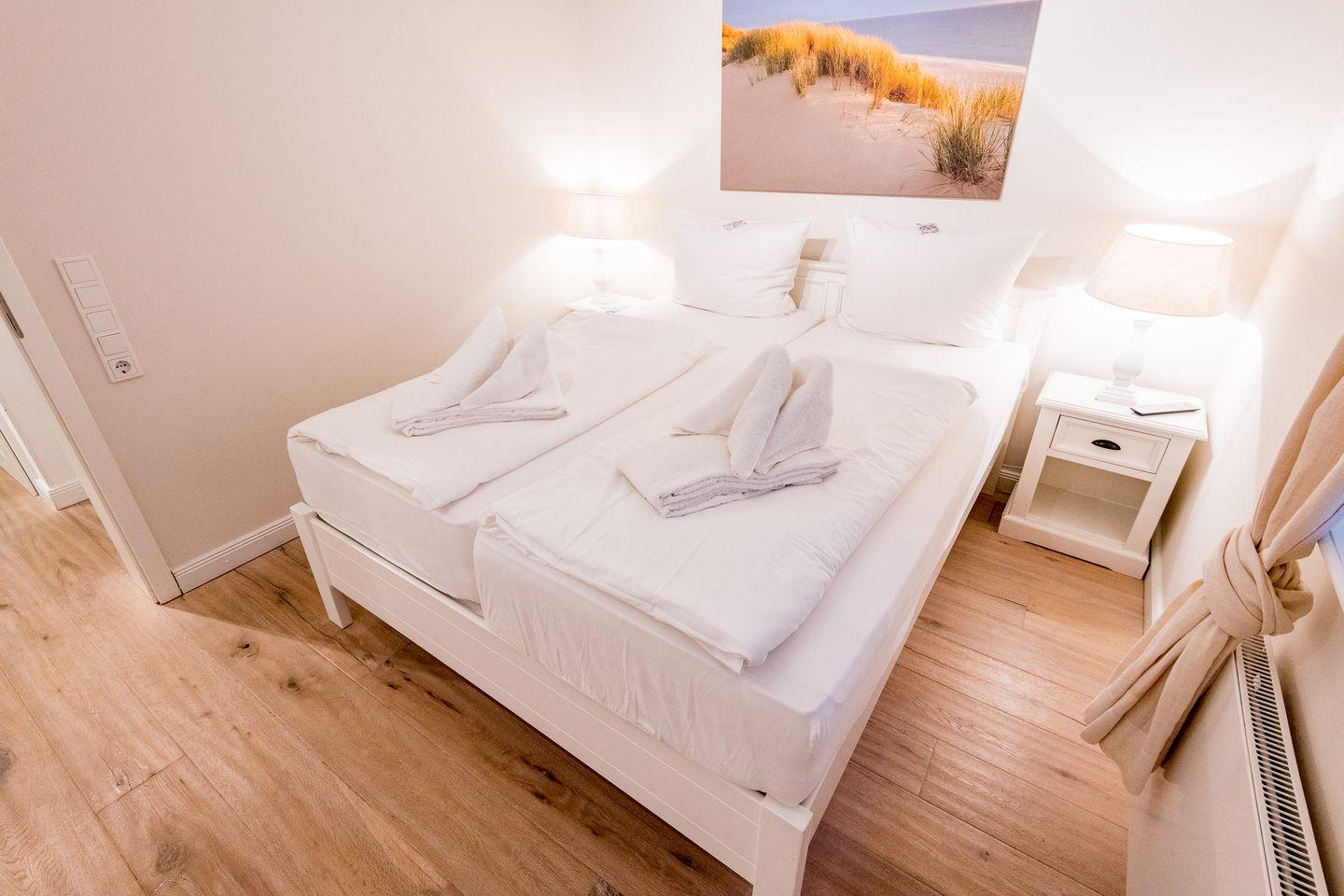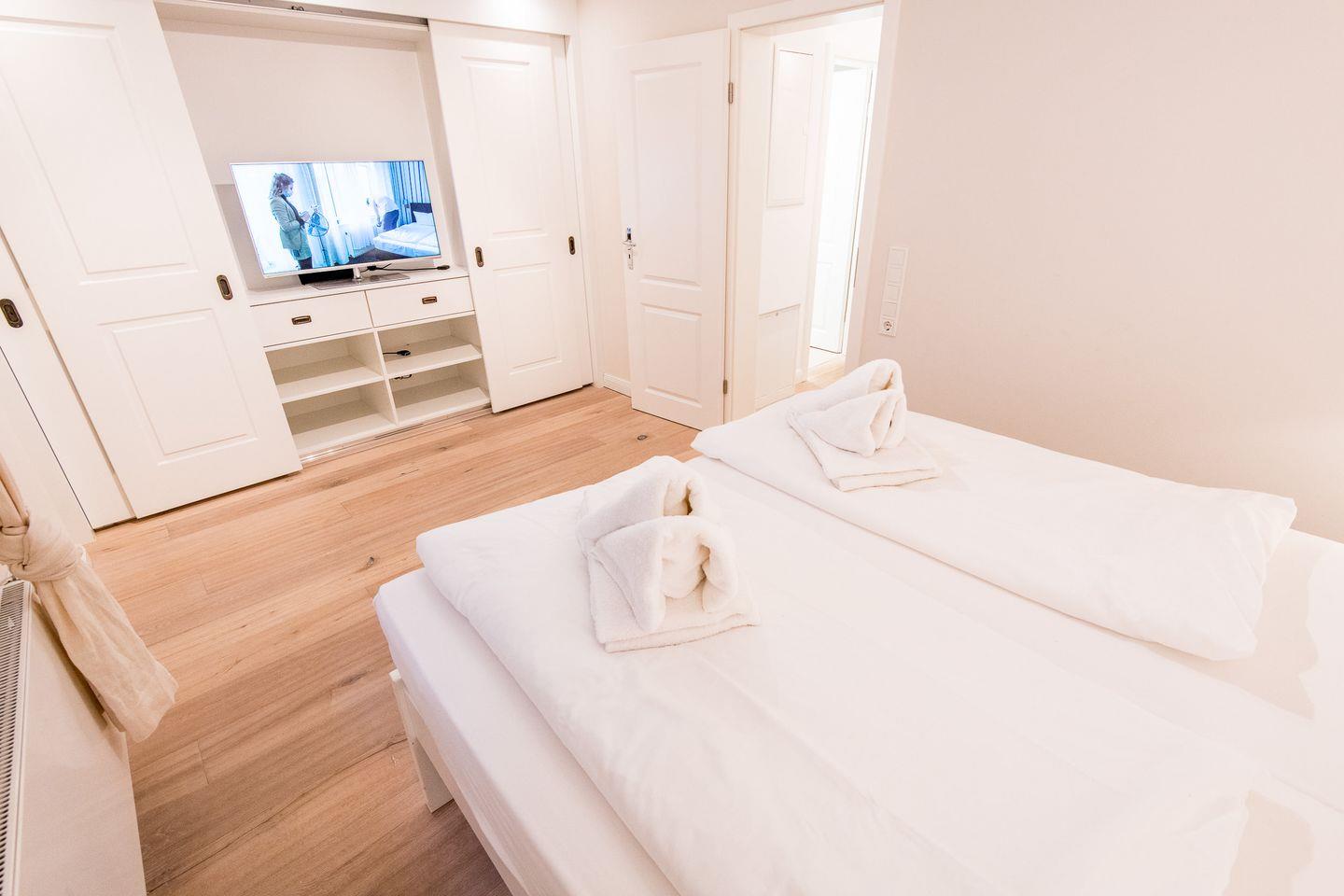 Das erste Schlafzimmer ist mit einem gemütlichen Doppelbett (2x 90x200 cm), einem geräumigen Einbauschrank, einer Kommode, einem Stuhl und einem TV ausgestattet. Das zweite Schlafzimmer bietet ebenfalls ein Doppelbett (2x 80x200 cm), einen Einbauschrank, einen Stuhl und TV, sodass alle Gäste hier einen ruhigen Rückzugsort finden.