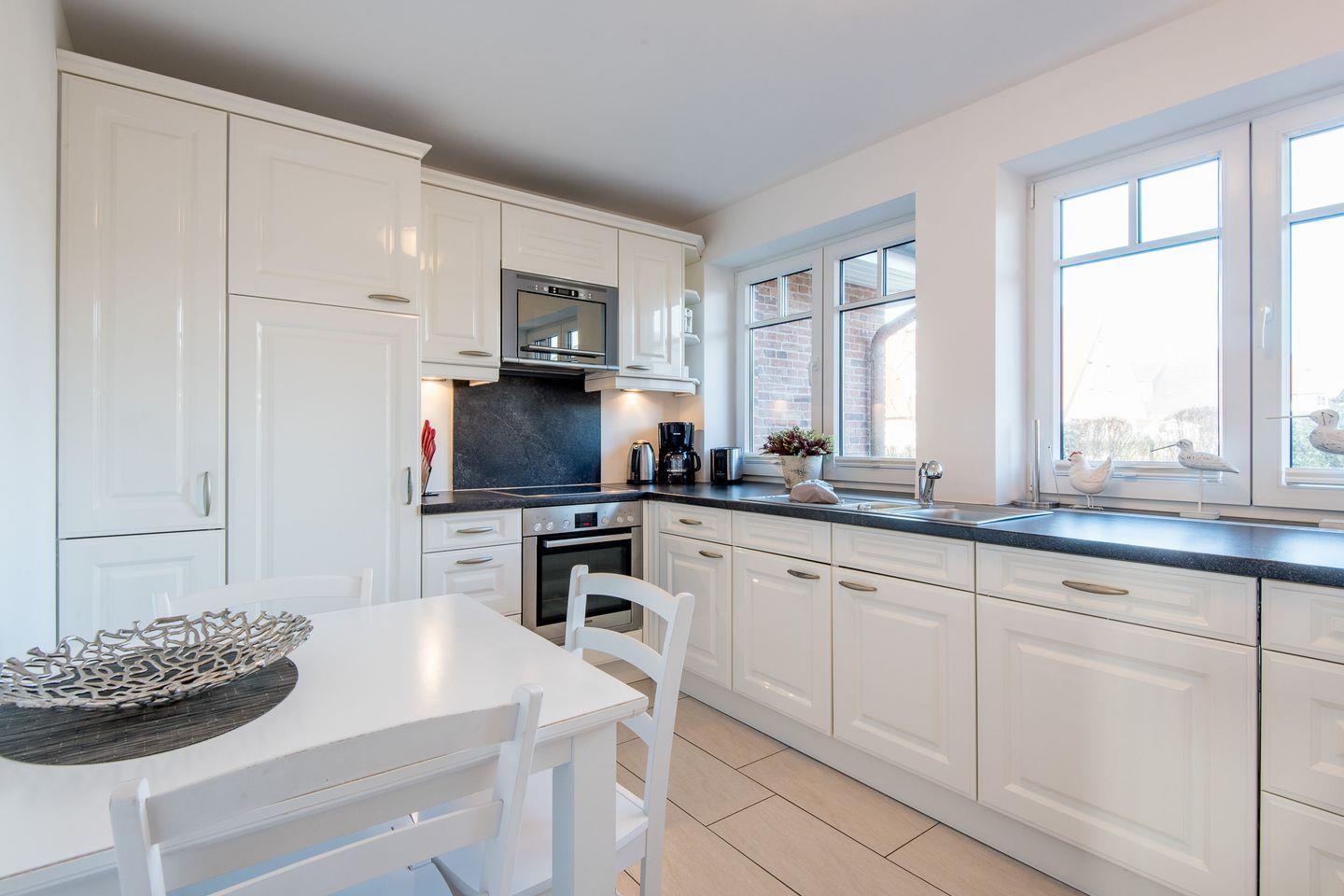 Die großzügige, separate Küche ist komplett ausgestattet und bietet allen Komfort für die Zubereitung Ihrer Mahlzeiten. Ausgestattet mit einem 4-flammigen Herd, Geschirrspüler und weiteren Annehmlichkeiten. Für das Frühstück steht Ihnen ein kleiner Tisch für zwei Personen zur Verfügung.