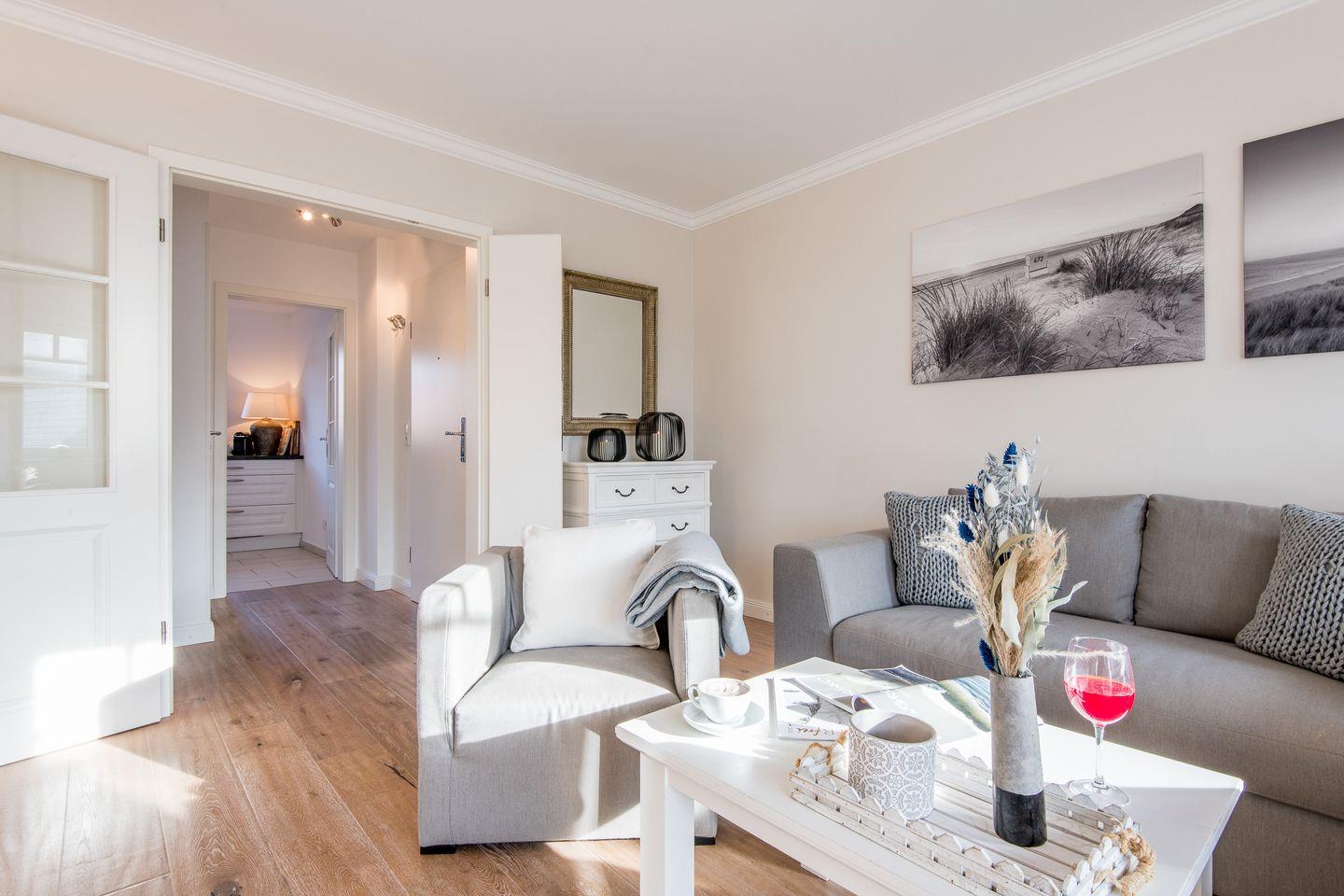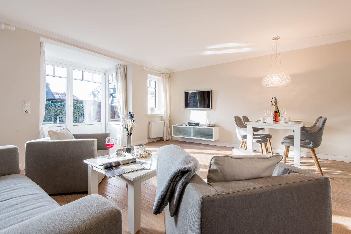 Das großzügige Wohnzimmer ist mit einem bequemen Sofa, Sesseln, einem TV und einem Esstisch für 4 Personen ausgestattet. Von hier aus gelangen Sie direkt auf die sonnige Süd-West-Terrasse, die mit einem Strandkorb und Gartenanteil ideale Voraussetzungen für Entspannung und Erholung bietet.