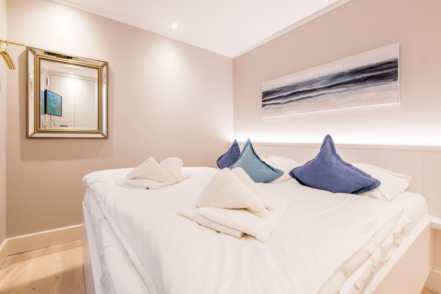 Das Hauptschlafzimmer ist mit einem hochwertigen Boxspringbett (180x200 cm) und einem TV ausgestattet – hier ist erholsamer Schlaf garantiert. Auch das zweite Schlafzimmer bietet ein komfortables Boxspringbett (180x200 cm) und TV und sorgt für entspannten Rückzugsraum.