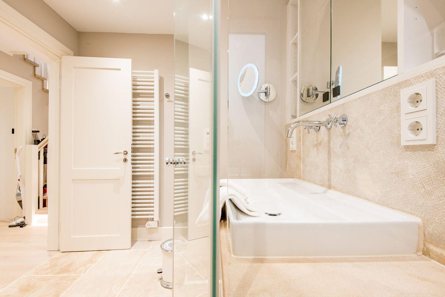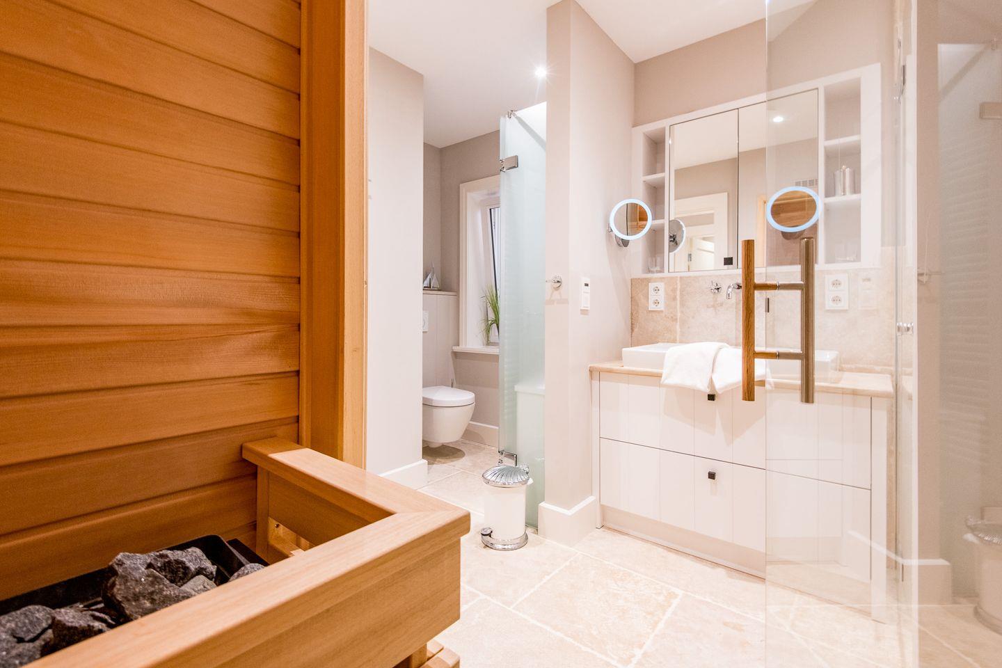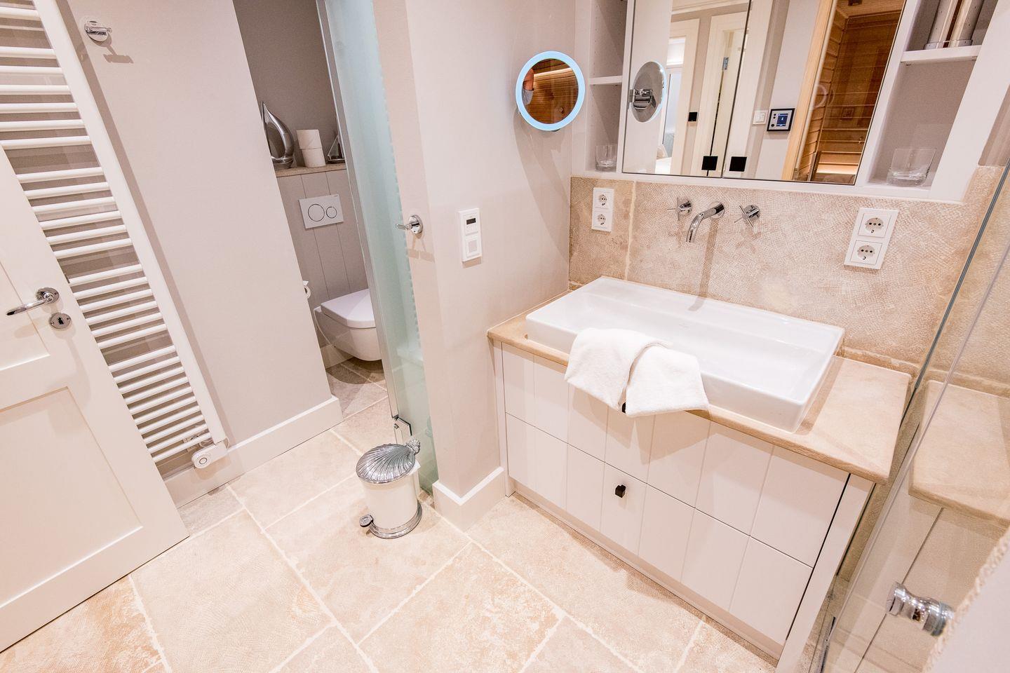 Das Badezimmer verfügt über eine großzügige Dusche, WC, Föhn und Handtuchwärmer. Ein weiteres Highlight ist die private Sauna mit Dampfdusche, die nach einem Tag am Strand oder an der frischen Nordseeluft wohltuende Erholung bietet. Ein separates Gäste-WC und ein praktischer Waschtrockner runden den Komfort ab.