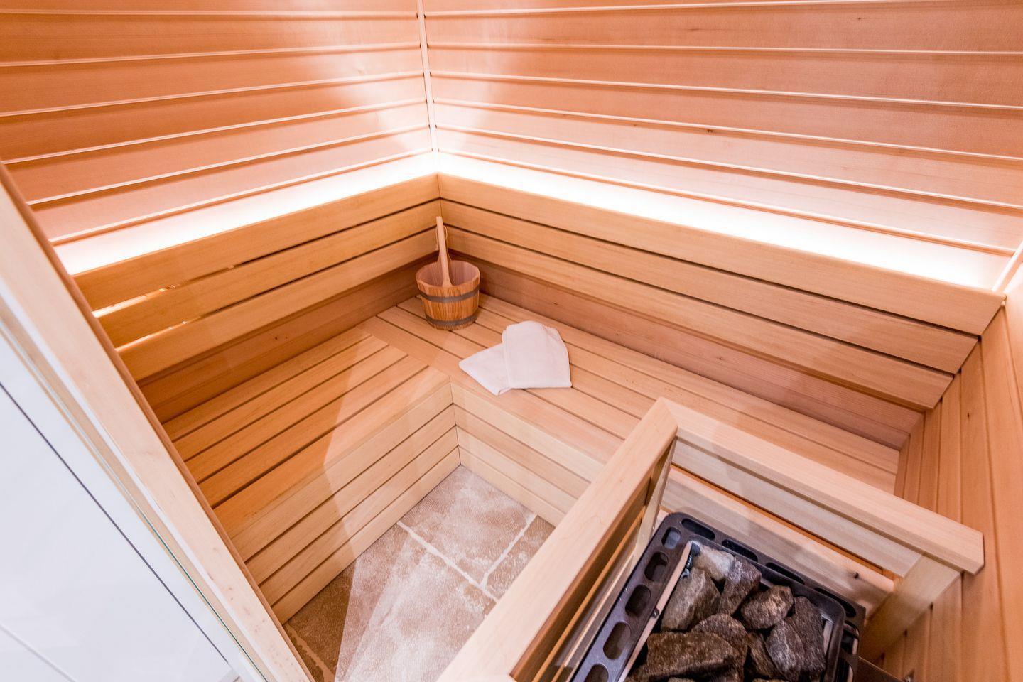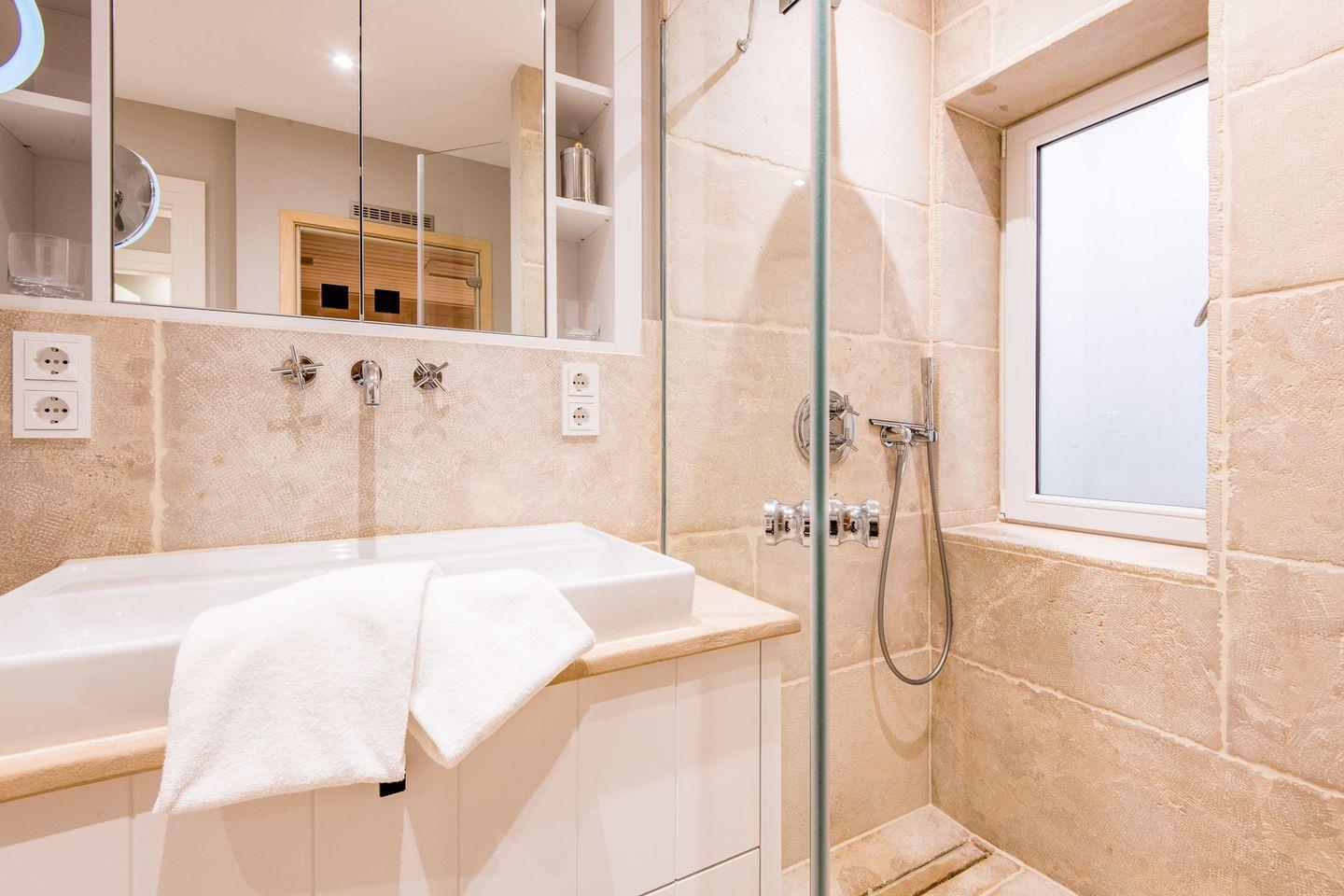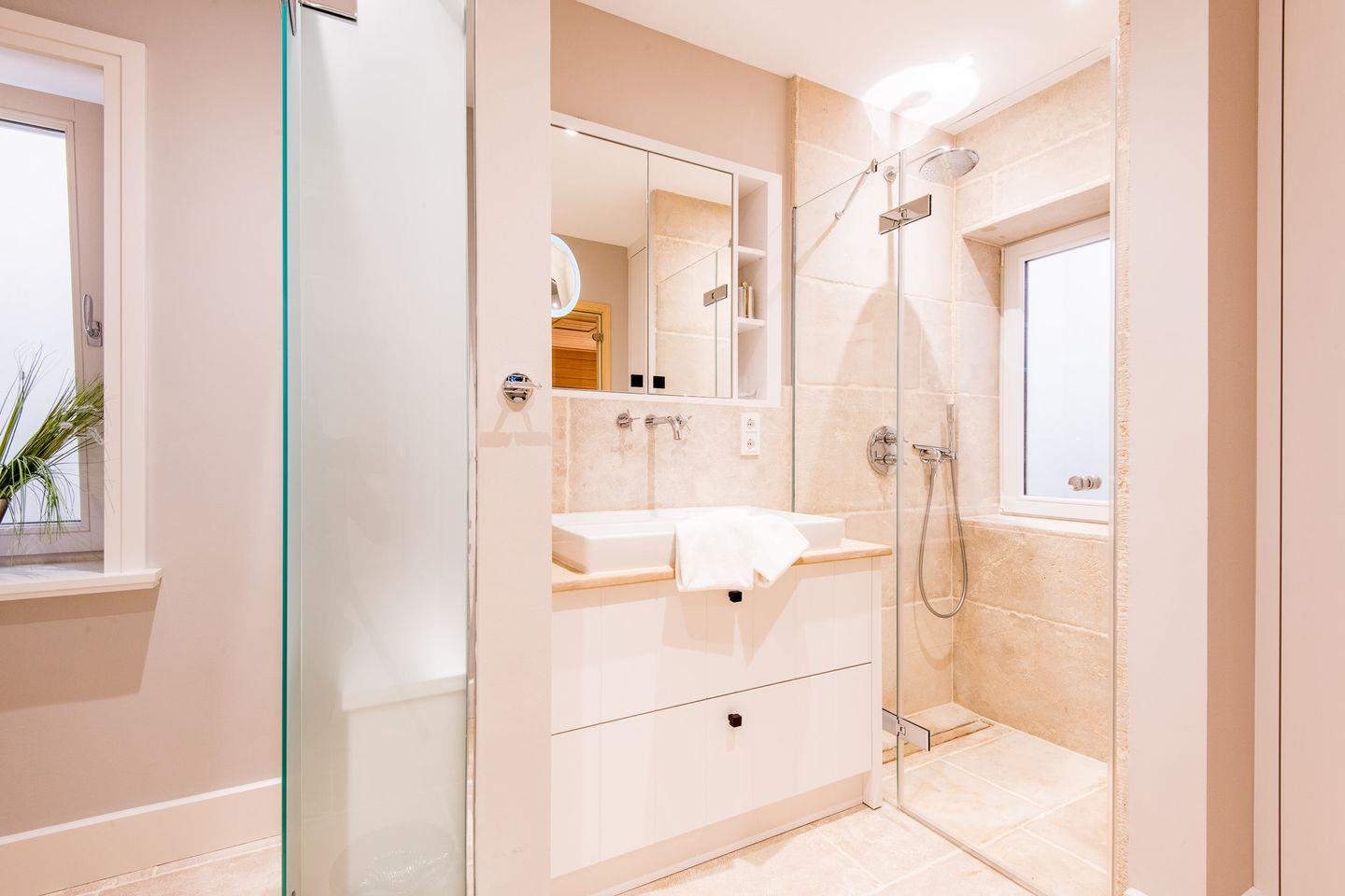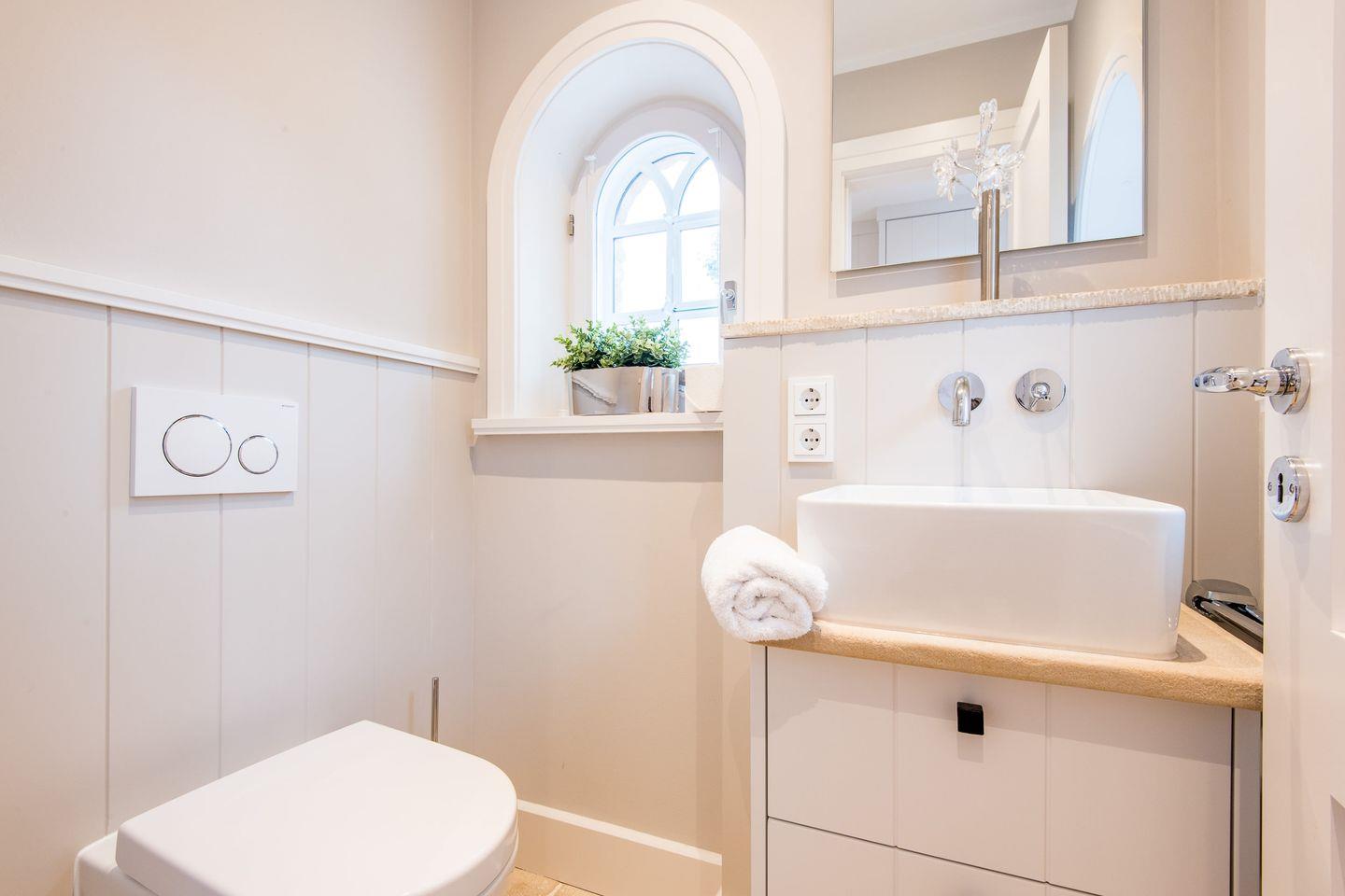 Das Badezimmer verfügt über eine großzügige Dusche, WC, Föhn und Handtuchwärmer. Ein weiteres Highlight ist die private Sauna mit Dampfdusche, die nach einem Tag am Strand oder an der frischen Nordseeluft wohltuende Erholung bietet. Ein separates Gäste-WC und ein praktischer Waschtrockner runden den Komfort ab.