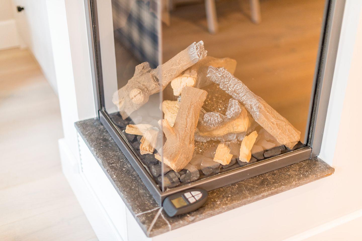 Das lichtdurchflutete Wohnzimmer besticht durch ein gemütliches Sofa, TV und einen einladenden Essbereich, der Platz für bis zu vier Personen bietet. Der moderne Gaskamin schafft eine besondere Wohlfühlatmosphäre – perfekt für entspannte Abende. Vom Wohnzimmer gelangen Sie direkt auf die möblierte Südterrasse, die zu sonnigen Stunden und erholsamen Momenten im Garten einlädt.