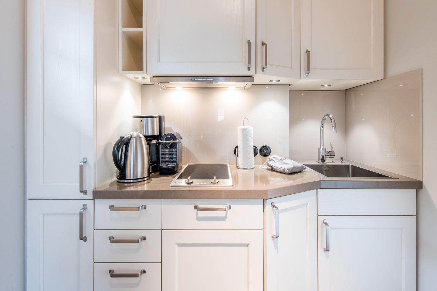 Die separate, hochwertige Küche ist praktisch eingerichtet und mit einem 2-flammigen Herd, Geschirrspüler und den notwendigen Utensilien ausgestattet, um kleinere Mahlzeiten in gemütlicher Runde zuzubereiten.