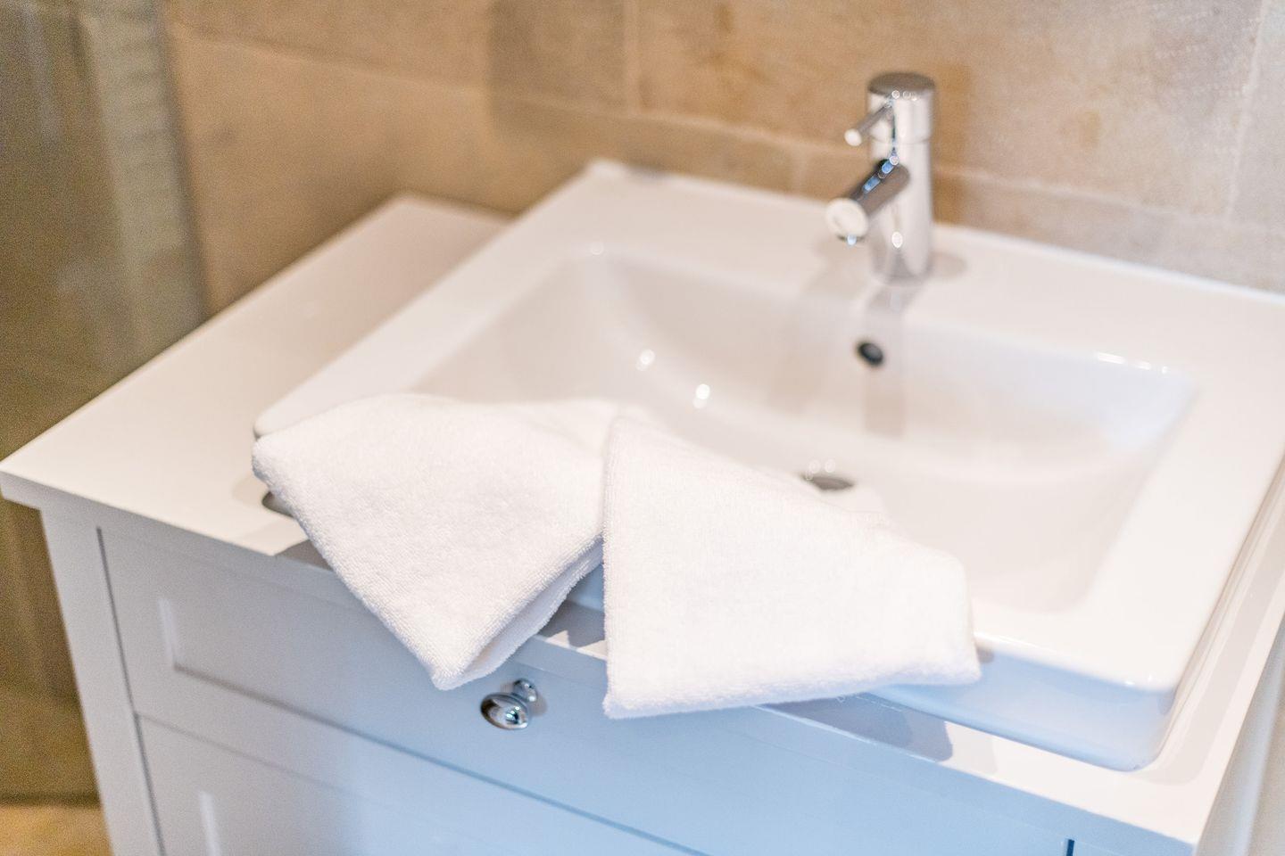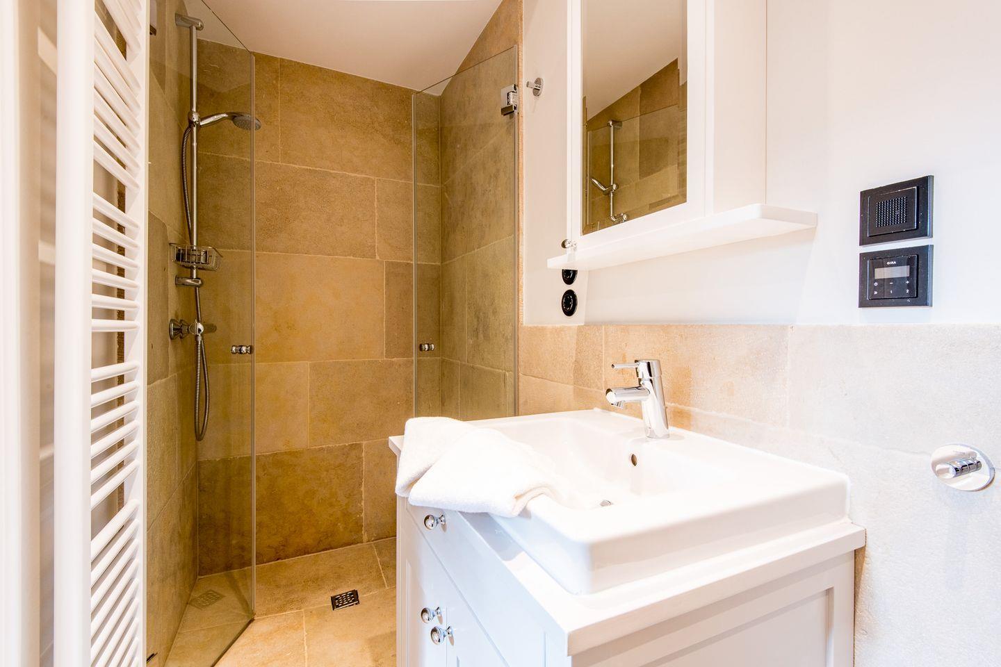 Das Badezimmer ist elegant gestaltet und verfügt über eine Dusche, WC und Föhn – ideal, um nach einem langen Tag am Strand zur Ruhe zu kommen.