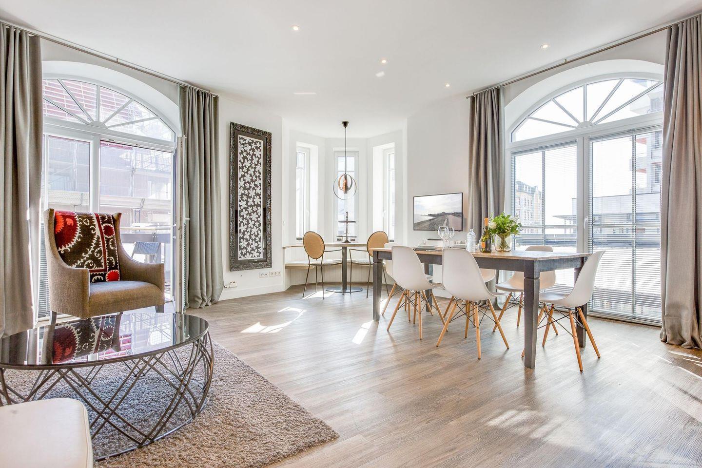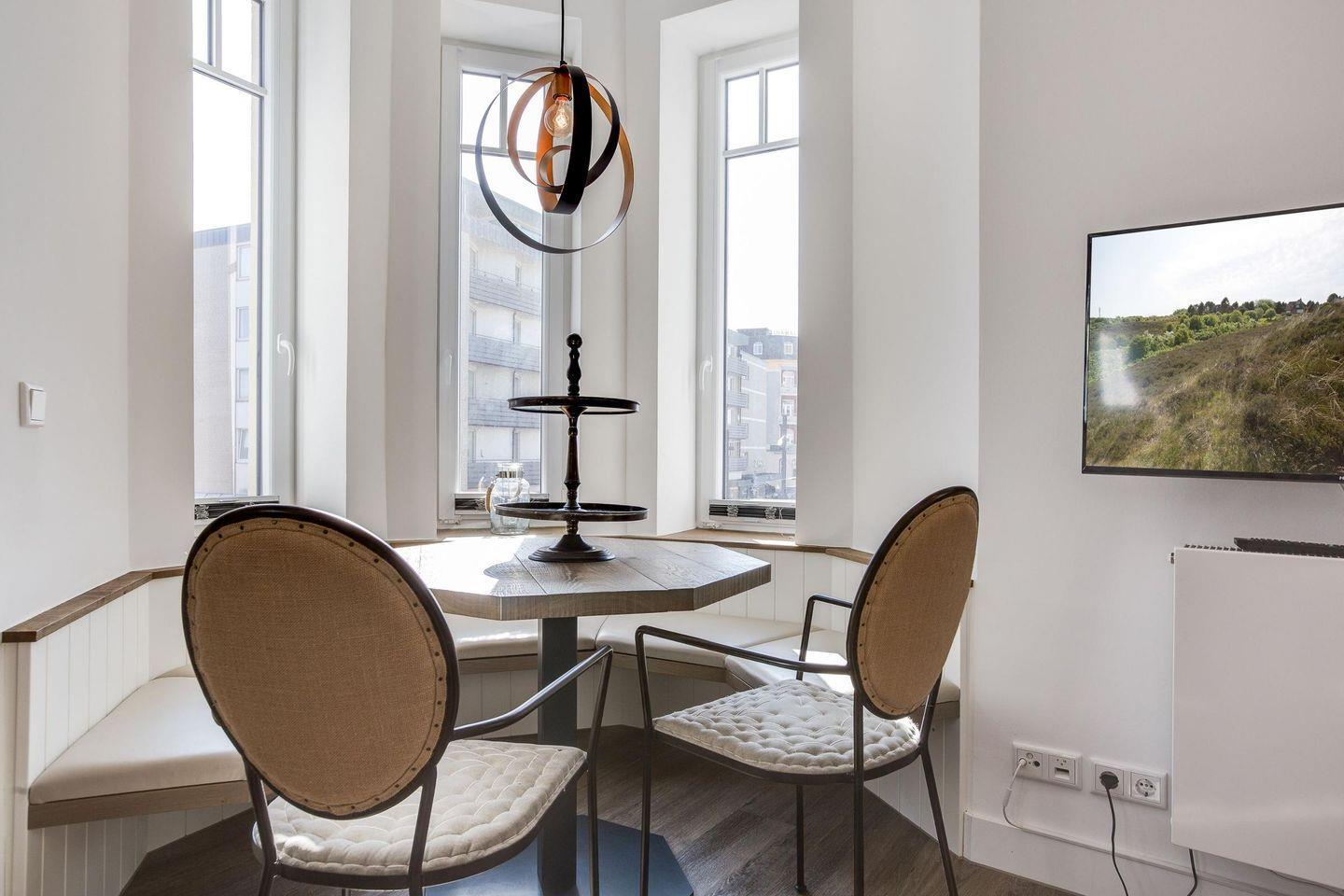 Im großzügigen Wohnzimmer erwartet Sie eine gemütliche Sitzecke mit Ecksofa und Sesseln, die ideal für entspannte Abende ist. Der Ausblick auf die lebhafte Friedrichstraße und das Meer ist ein Highlight dieser Wohnung. Die Essecke mit einer charmanten Sitzbank befindet sich im runden Turm des Hauses und bietet durch die Rundum-Verglasung einen einmaligen Panoramablick. Von hier aus gelangen Sie direkt auf den sonnigen Süd-Balkon, wo Sie die frische Meeresbrise genießen können.