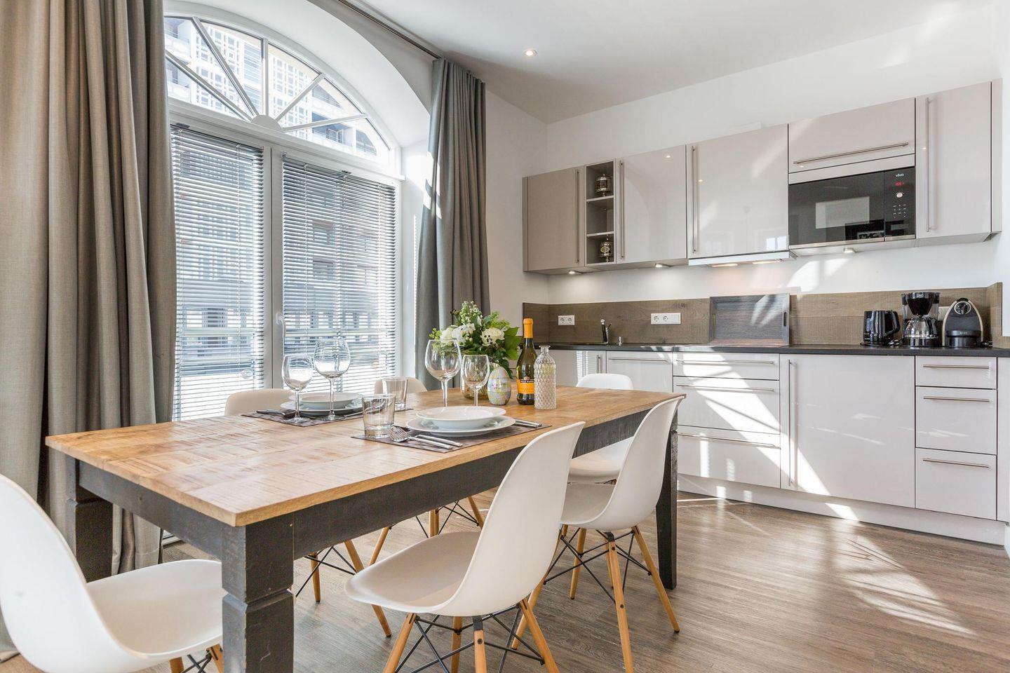 Die offene Küche ist modern und voll ausgestattet, sodass es Ihnen an nichts fehlt. Hier können Sie Ihre Lieblingsgerichte zubereiten und am großzügigen Esstisch mit sechs Stühlen genießen, ideal für ein Abendessen oder ein gemütliches Frühstück.
