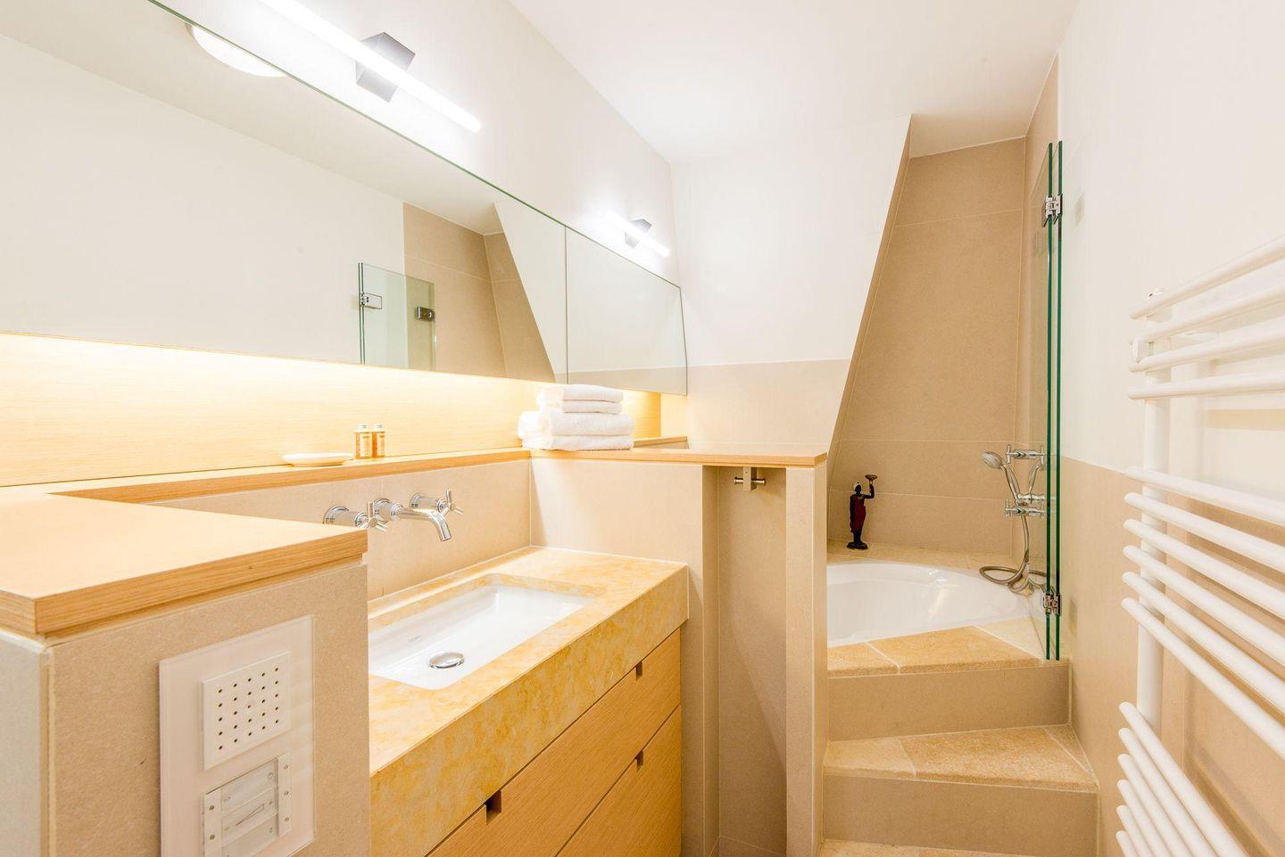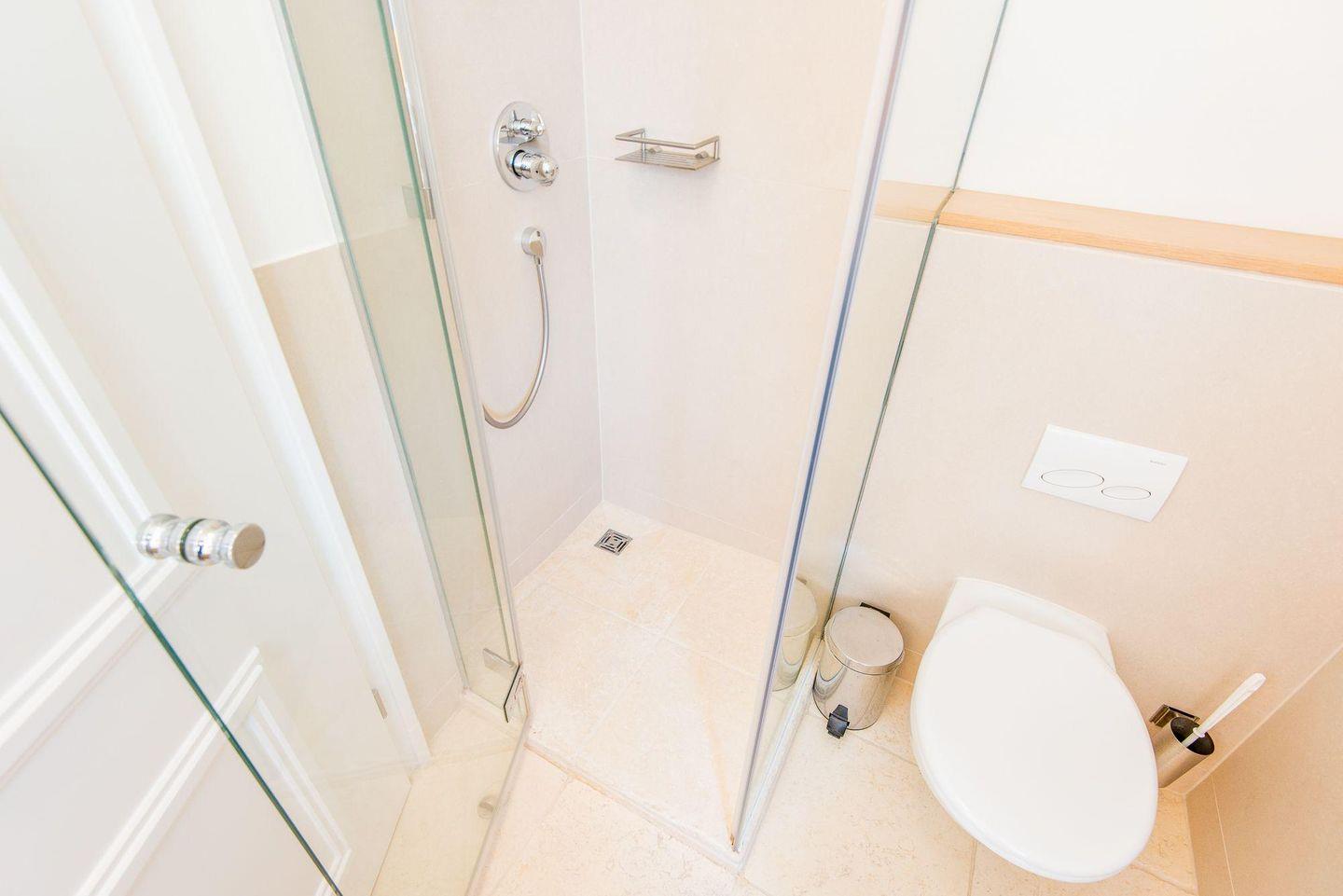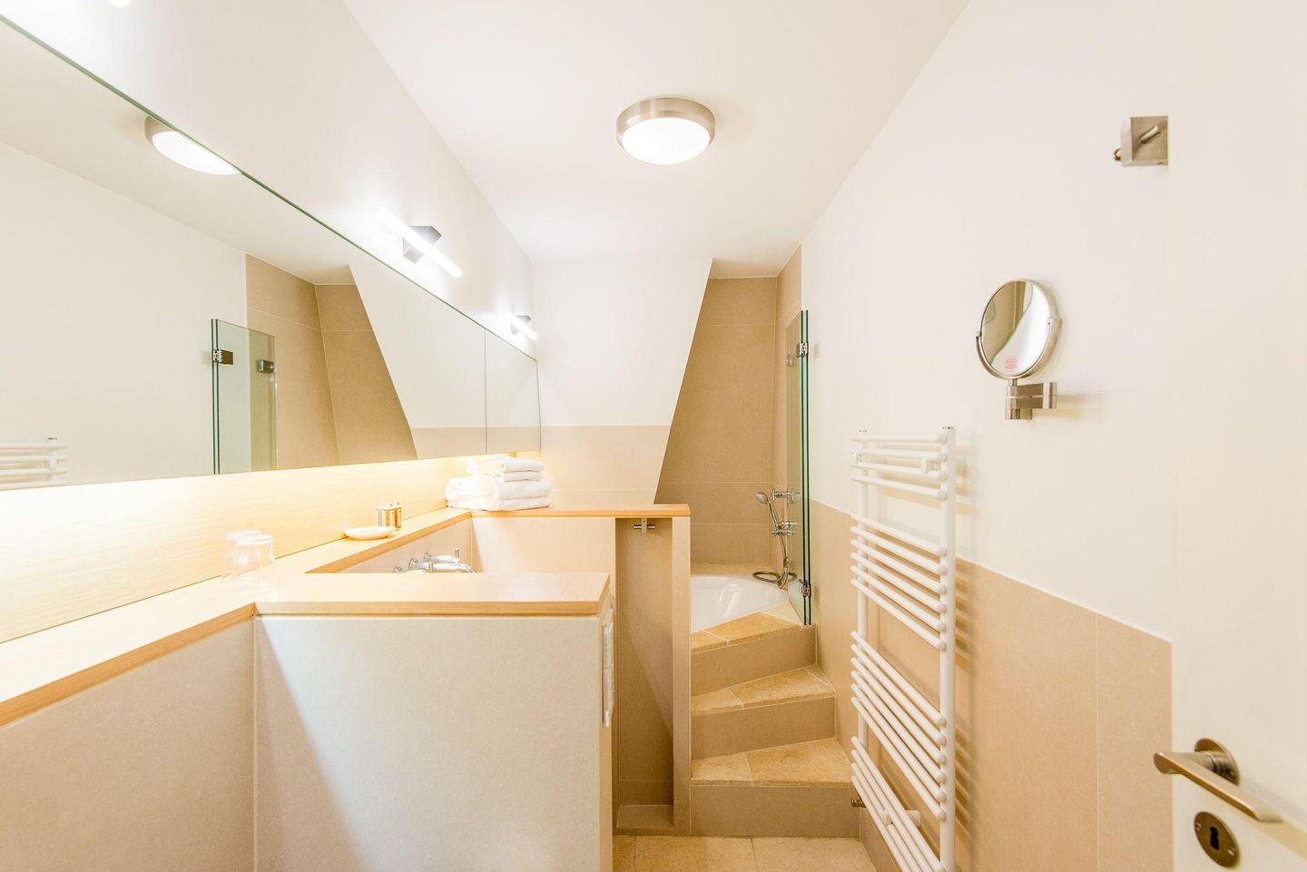 Das erste Badezimmer ist großzügig gestaltet und verfügt über eine Badewanne, eine Dusche, ein WC und einen Handtuchwärmer. Der Natursteinfußboden verleiht dem Raum eine luxuriöse Note. Das zweite Badezimmer ist mit einer Dusche, einem WC, einem Handtuchwärmer und Tageslicht ausgestattet – ebenfalls mit elegantem Natursteinfußboden.