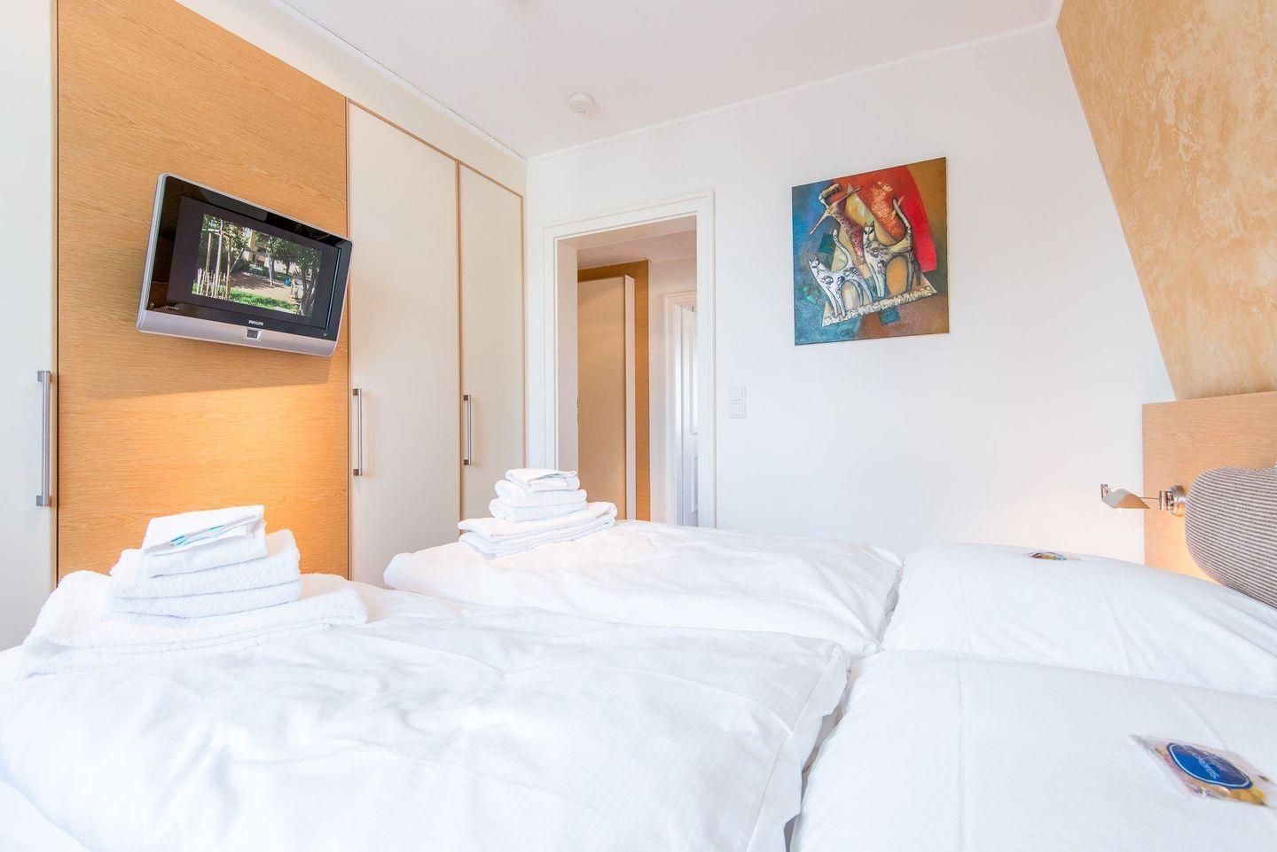 Das erste Schlafzimmer ist mit einem Doppelbett (1x 90x200 cm, 1x 80x200 cm), einem TV und einem Einbauschrank ausgestattet. Das zweite Schlafzimmer verfügt ebenfalls über ein Doppelbett (1x 90x200 cm, 1x 80x200 cm), einen TV und einen Einbauschrank – beide Schlafzimmer bieten viel Komfort und Erholung.