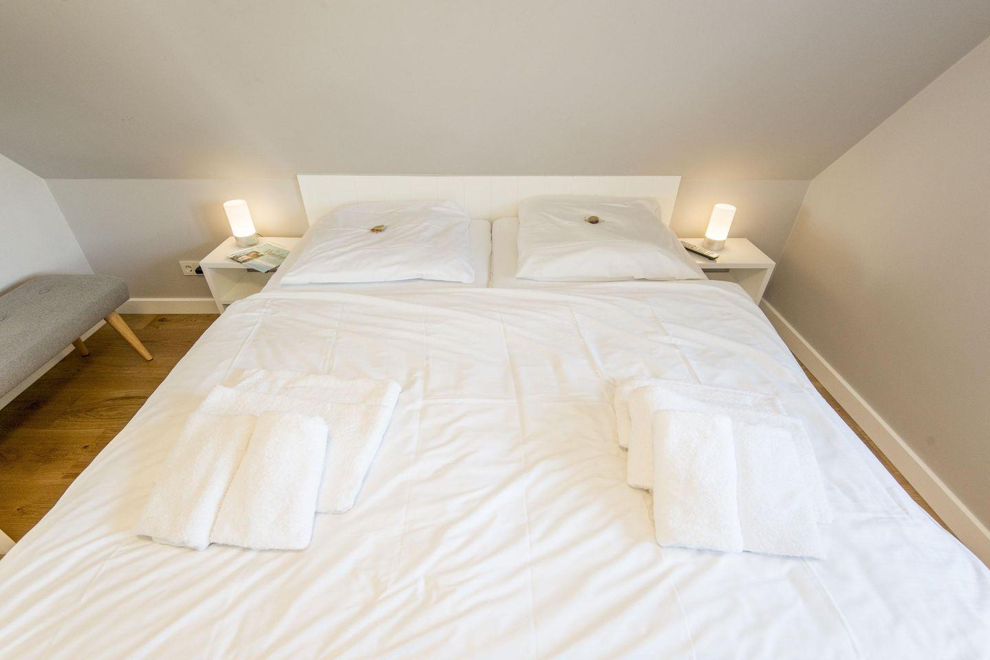 Das Schlafzimmer ist mit einem komfortablen Doppelbett (2x 90x200 cm) und einem geräumigen Kleiderschrank eingerichtet, in dem Sie Ihre Urlaubsgarderobe bequem unterbringen können.
