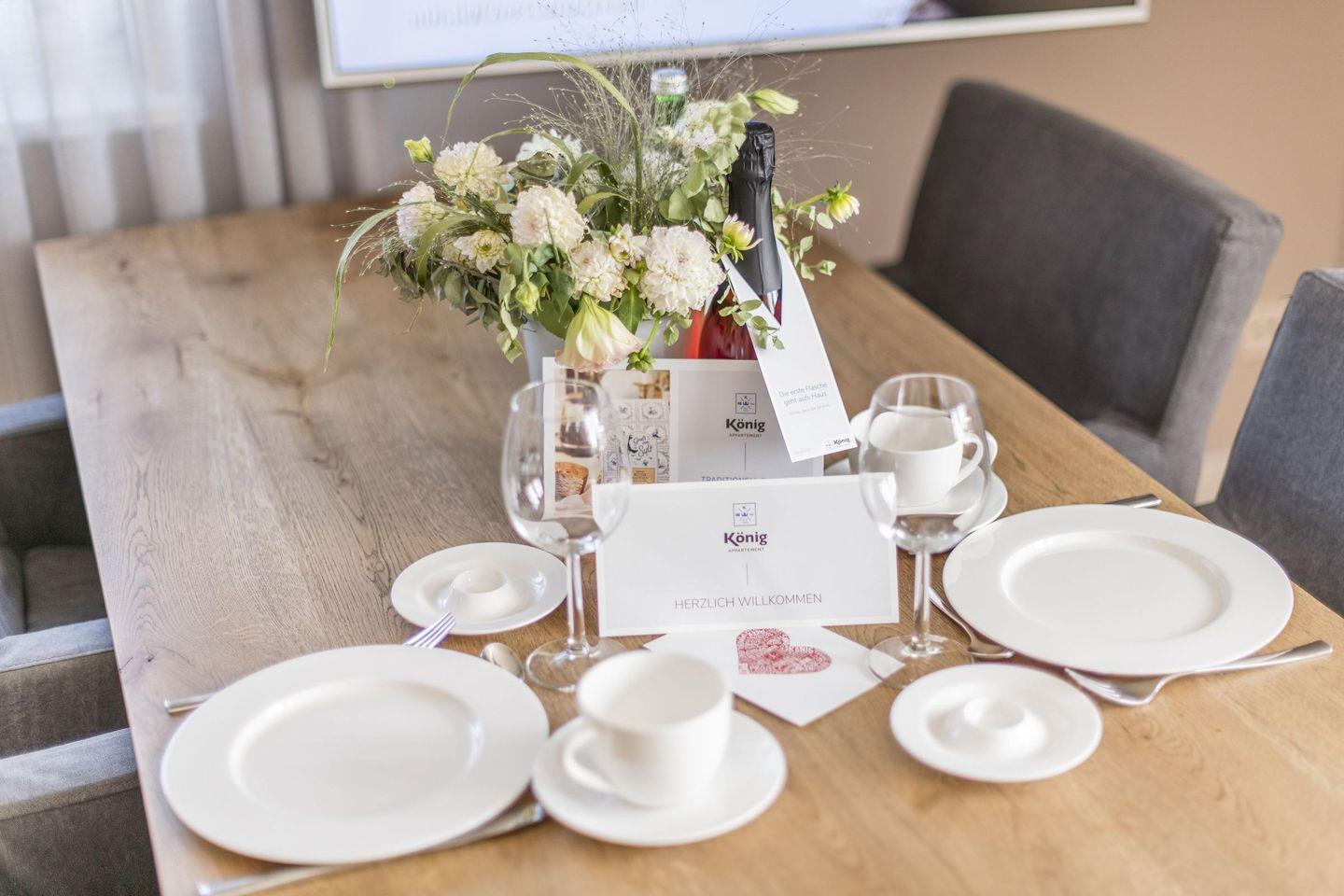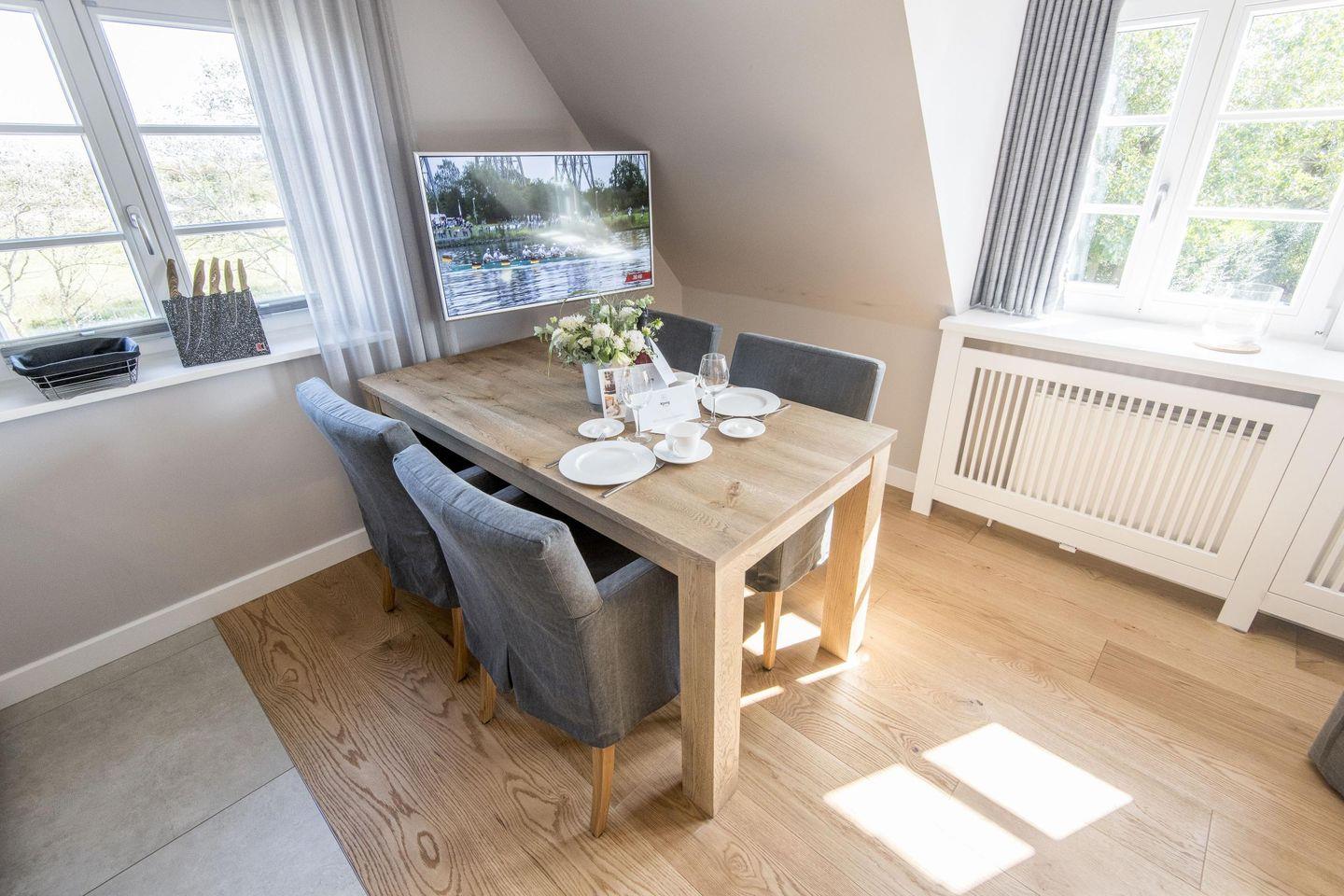Die moderne, offene Küche ist mit einem Cerankochfeld und allen nötigen Geräten ausgestattet, um kleine Mahlzeiten oder umfangreiche Dinner zuzubereiten. Der angrenzende Essbereich bietet Platz für gemeinsame Mahlzeiten und gemütliche Abende.