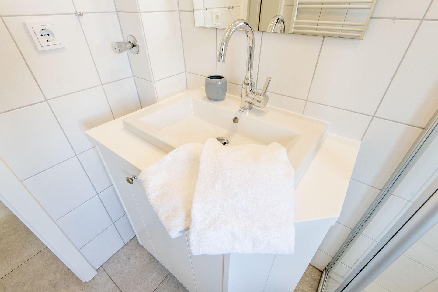 Das Badezimmer ist funktional und modern gestaltet und verfügt über eine ebenerdige Dusche, WC, Handtuchwärmer und Fön, um Ihnen einen angenehmen Start in den Tag zu ermöglichen.