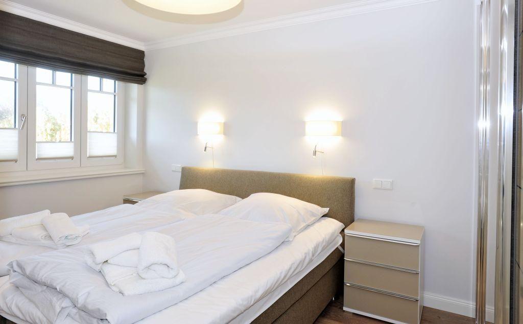 Das Hauptschlafzimmer ist nach Süden ausgerichtet und bietet ein komfortables Doppelbett (180x200 cm), einen Kleiderschrank und einen TV. Das zweite Schlafzimmer liegt nach Osten und verfügt über ein etwas kleineres Doppelbett (160x200 cm), ebenfalls mit Kleiderschrank und TV ausgestattet.