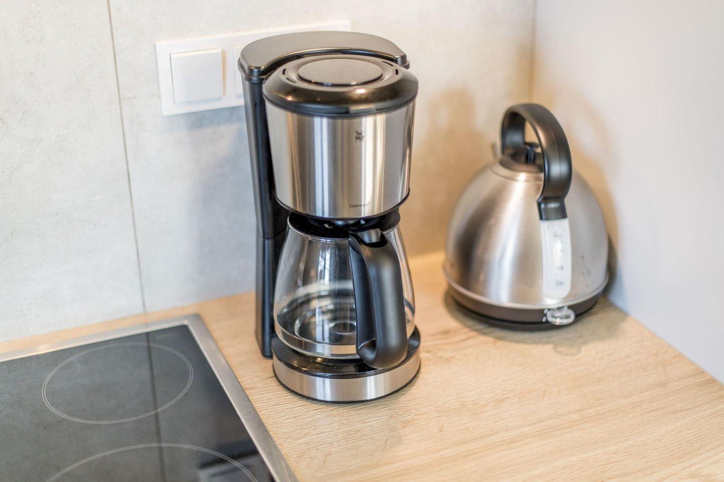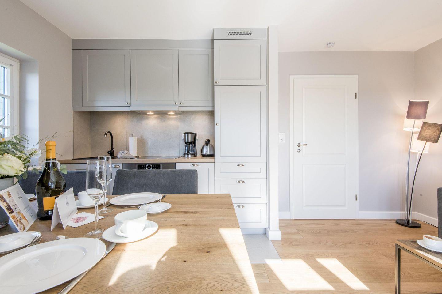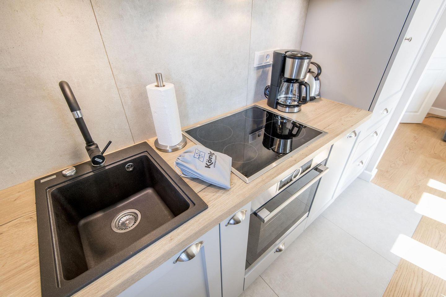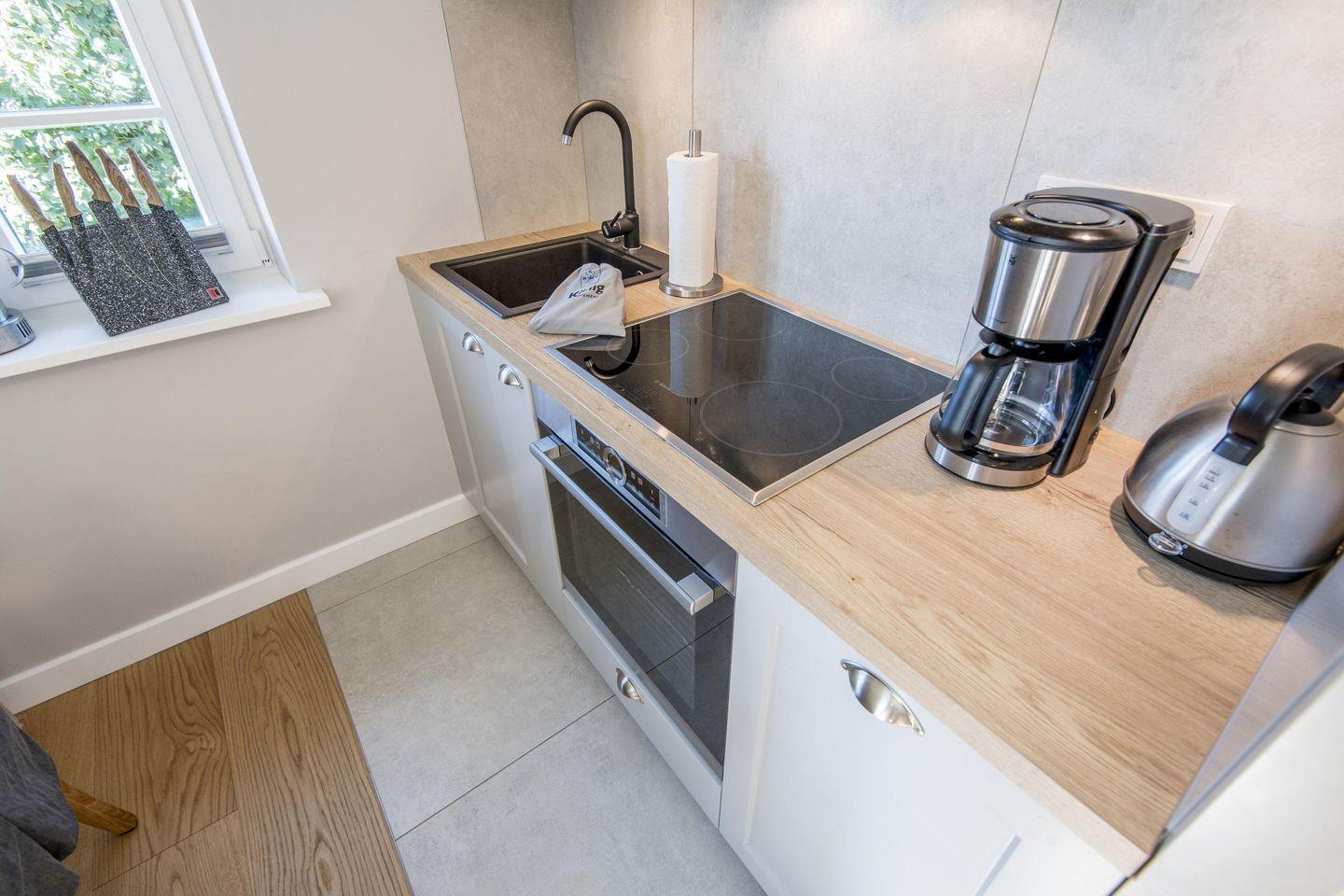 Die Küche ist zum Wohnbereich offen gestaltet und bietet alles, was Sie zur Zubereitung leckerer Mahlzeiten benötigen. Ein modernes Cerankochfeld und weitere Annehmlichkeiten sorgen für eine gut ausgestattete Umgebung, in der Kochen Freude macht.