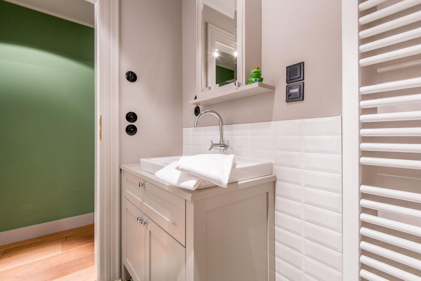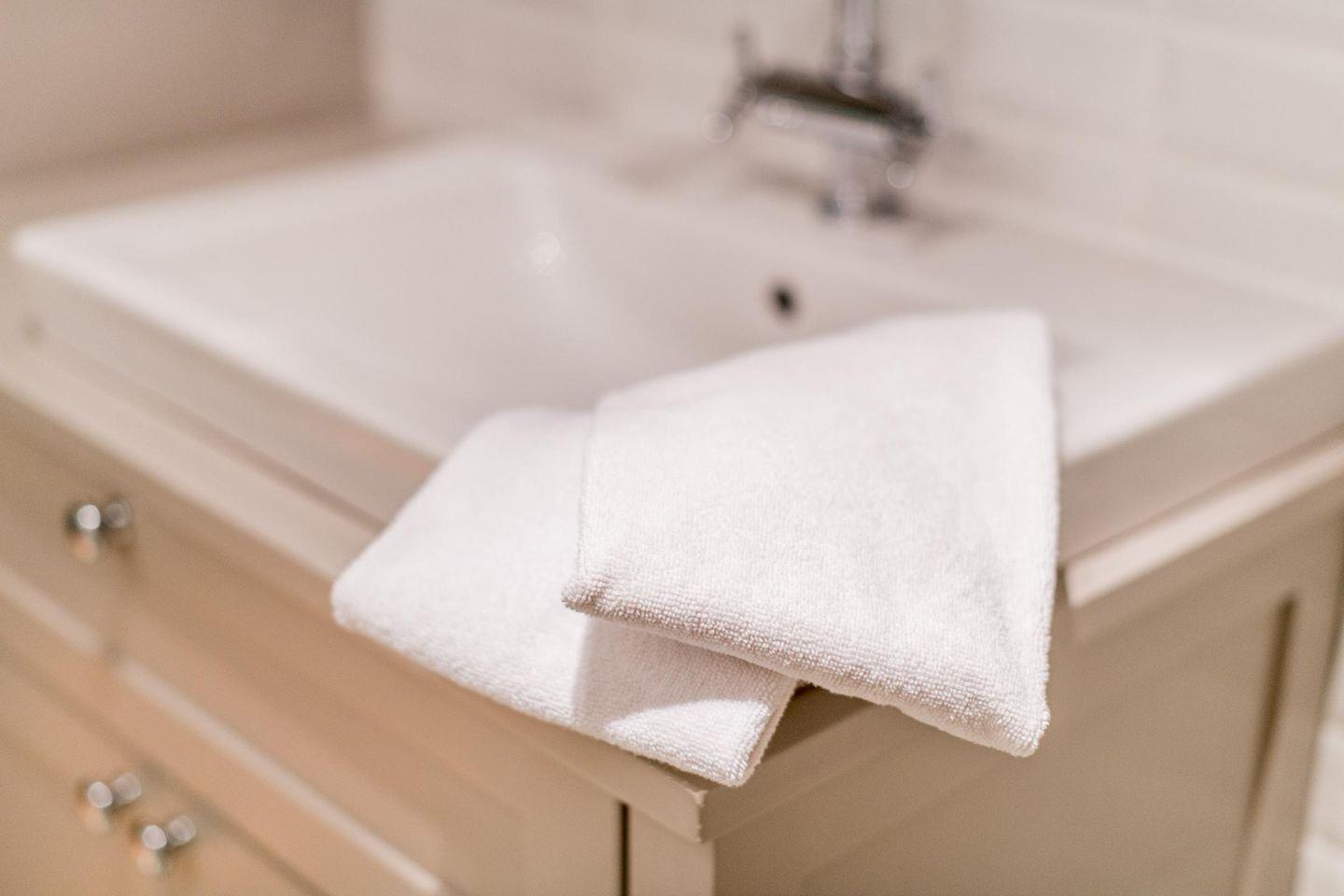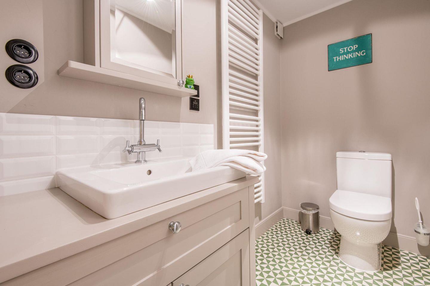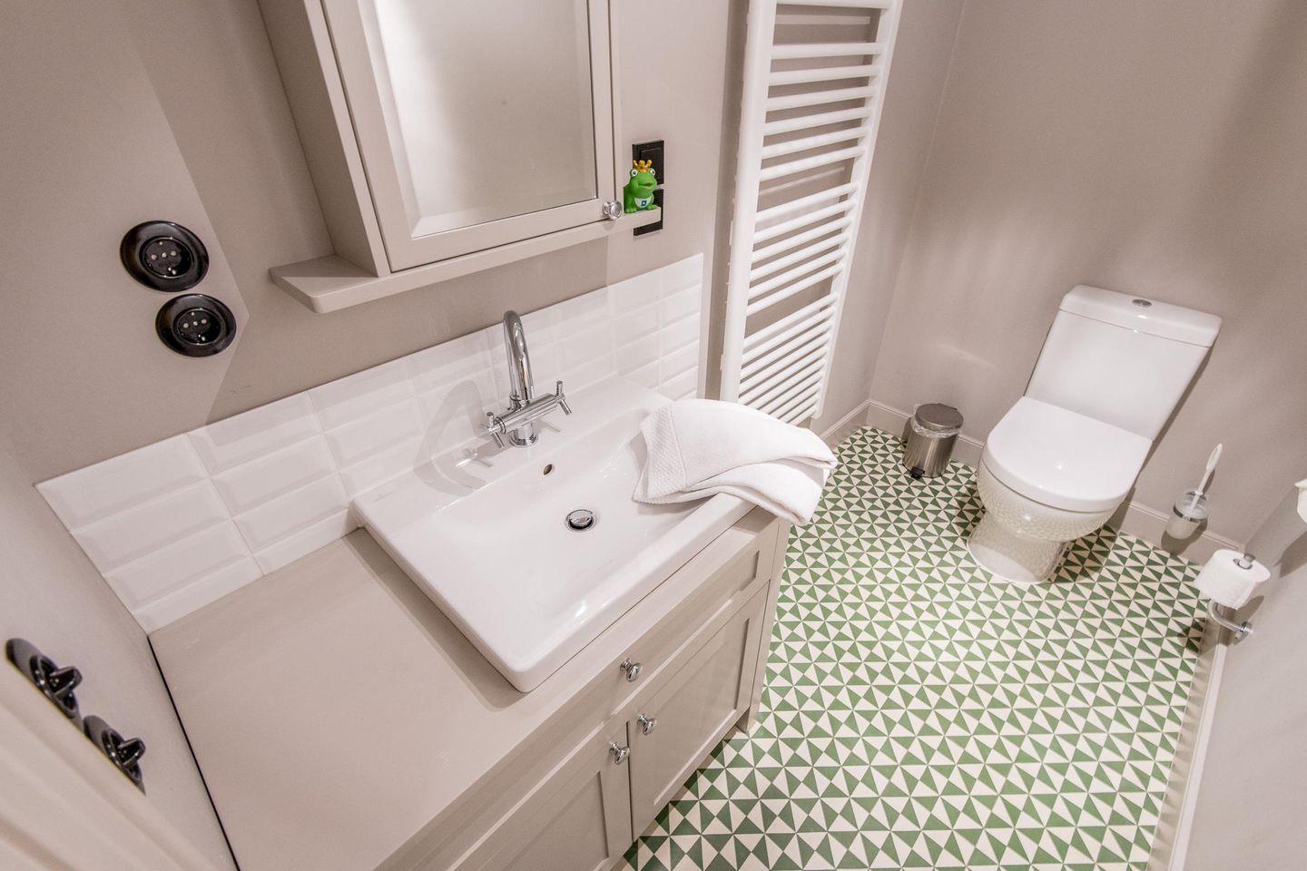 Das moderne Badezimmer ist mit einer ebenerdigen Dusche, WC und einem Handtuchwärmer ausgestattet und bietet alles, was Sie für einen erfrischenden Start in den Tag benötigen.