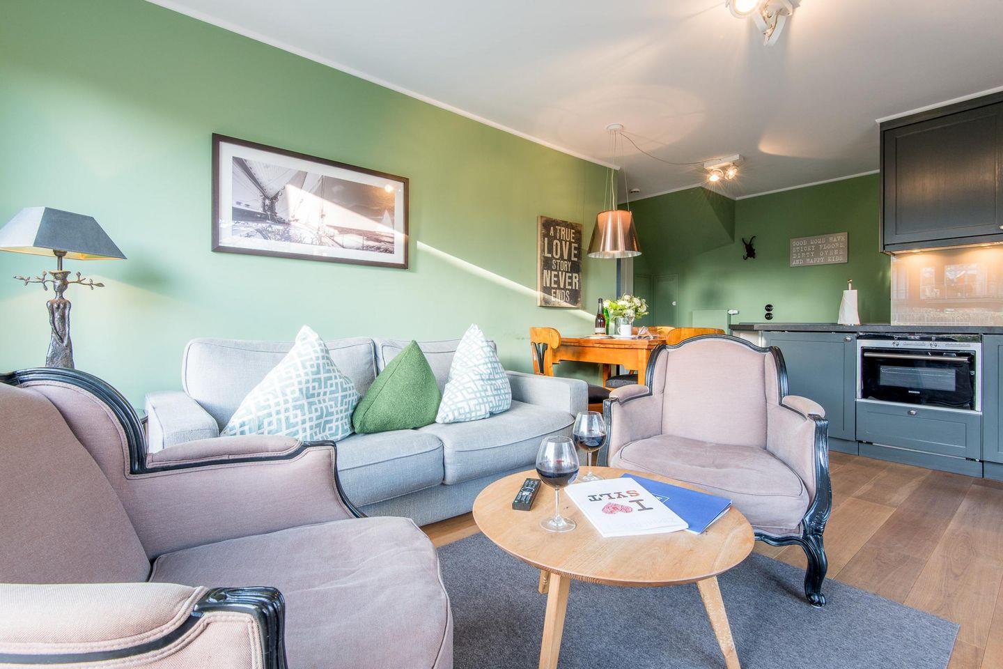 Das Wohnzimmer ist stilvoll gestaltet und bietet mit einer komfortablen Schlafcouch (160x200 cm) und zwei Sesseln, einer Kommode sowie einem TV die perfekte Atmosphäre zum Entspannen. Der gemütliche Essbereich ist für vier Personen ausgelegt und eignet sich ideal für gemeinsame Mahlzeiten und gesellige Abende.