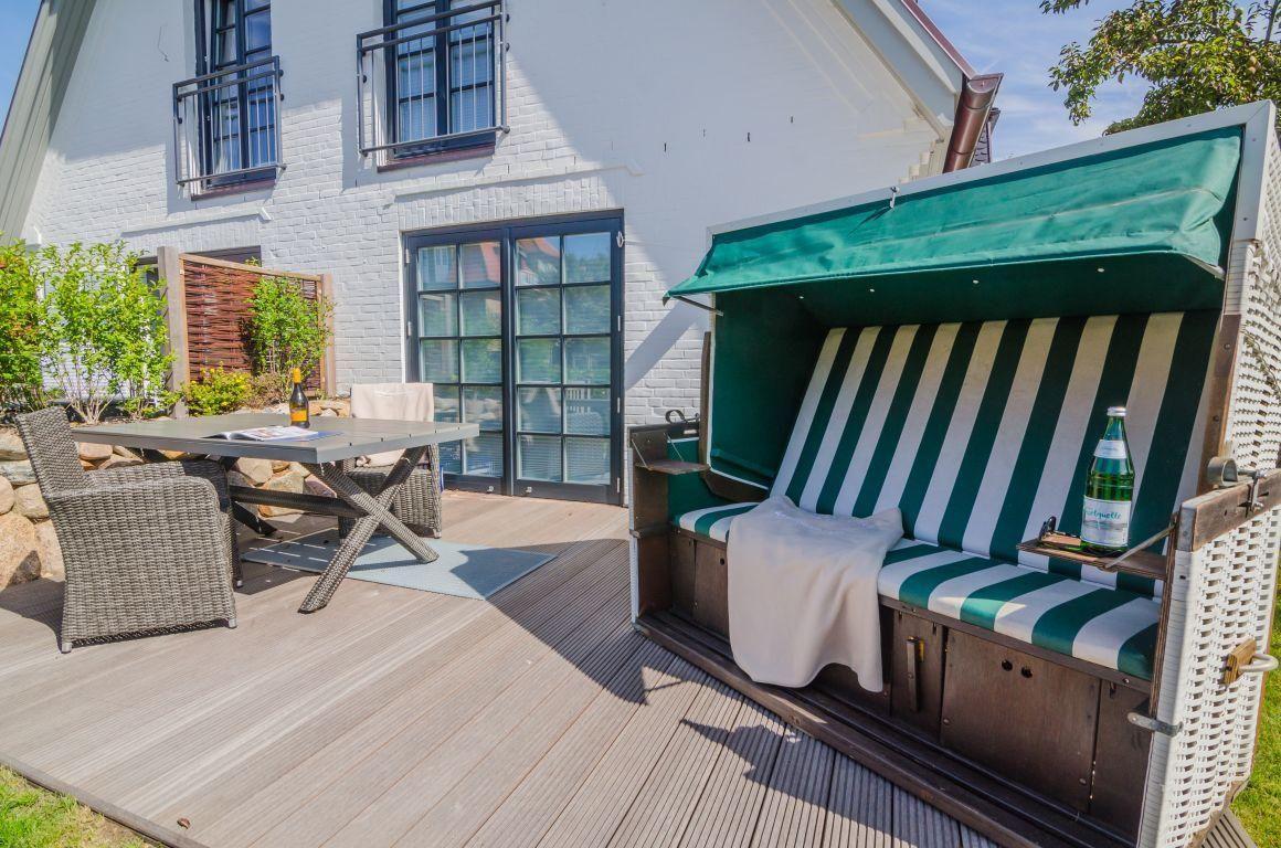 Zur Entspannung nach einem ereignisreichen Tag steht Ihnen ein exklusiver Wellnessbereich mit Sauna und Dampfbad zur Verfügung. In der gemeinschaftlichen Waschküche finden Sie zwei Waschtrockner, die kostenfrei genutzt werden können. Die zur Wohnung gehörende, möblierte Terrasse mit Saison-Strandkorb (ca. April bis Oktober) lädt zum Verweilen im Freien ein.