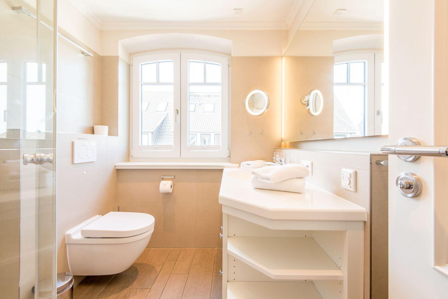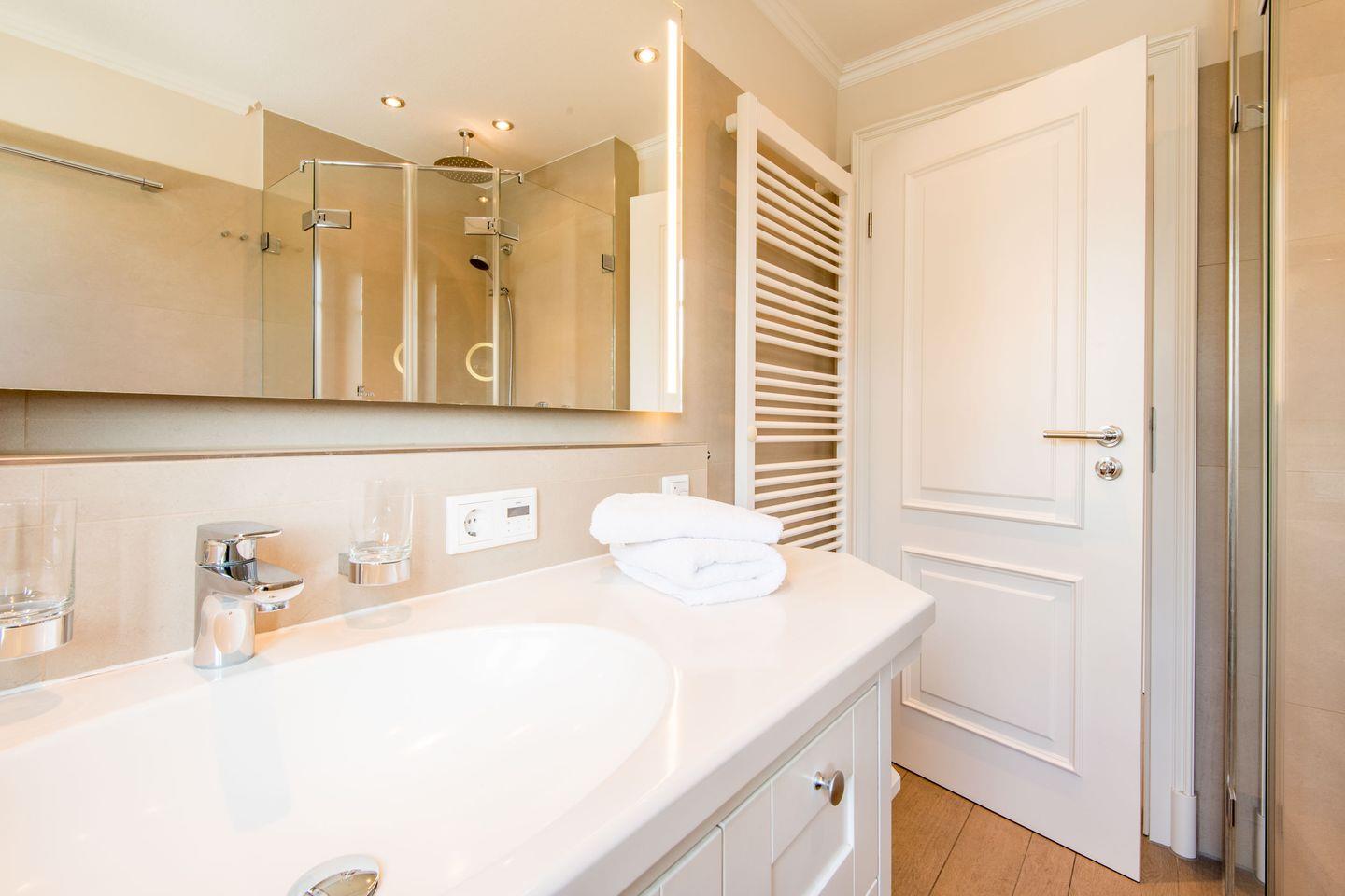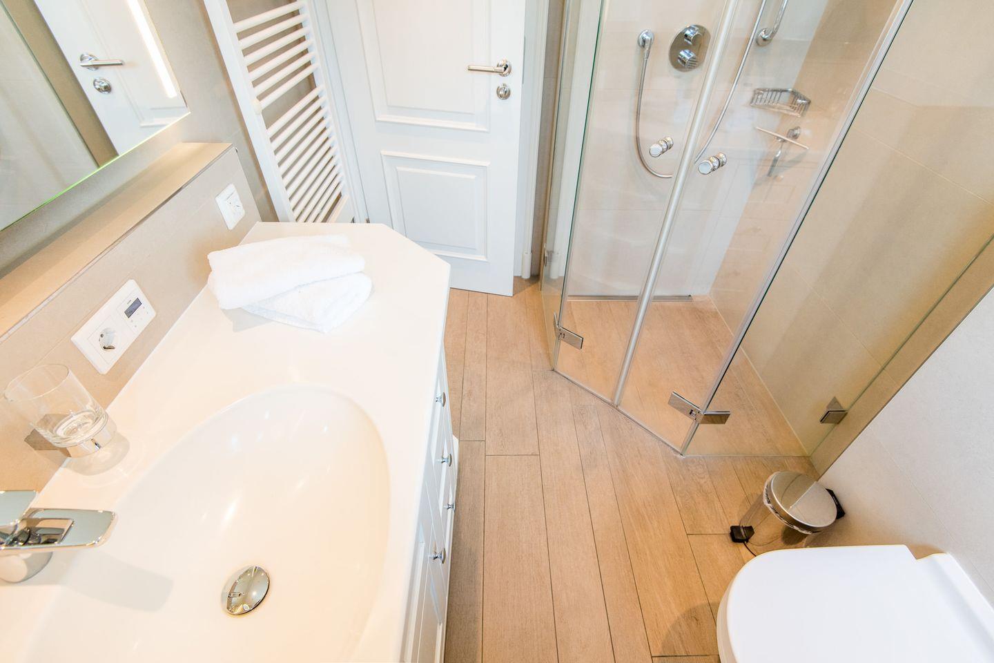 Das moderne Badezimmer verfügt über eine ebenerdige Regendusche, WC, Handtuchwärmer, Föhn und Tageslicht – ideal für entspannte Morgen- und Abendrituale.