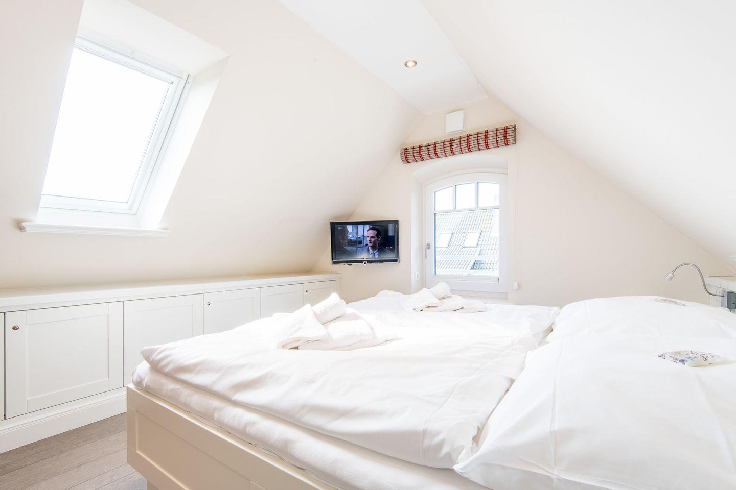 Das Hauptschlafzimmer verfügt über ein komfortables Doppelbett (2x 90x200 cm), ein Einbauschrank und einen TV. Der Blick aus dem Fenster reicht bis zu den Dünen – ein Highlight am Morgen. Das zweite Schlafzimmer ist mit einem etwas kleineren Doppelbett (140x200 cm), einem Einbauschrank und einem weiteren TV ausgestattet.