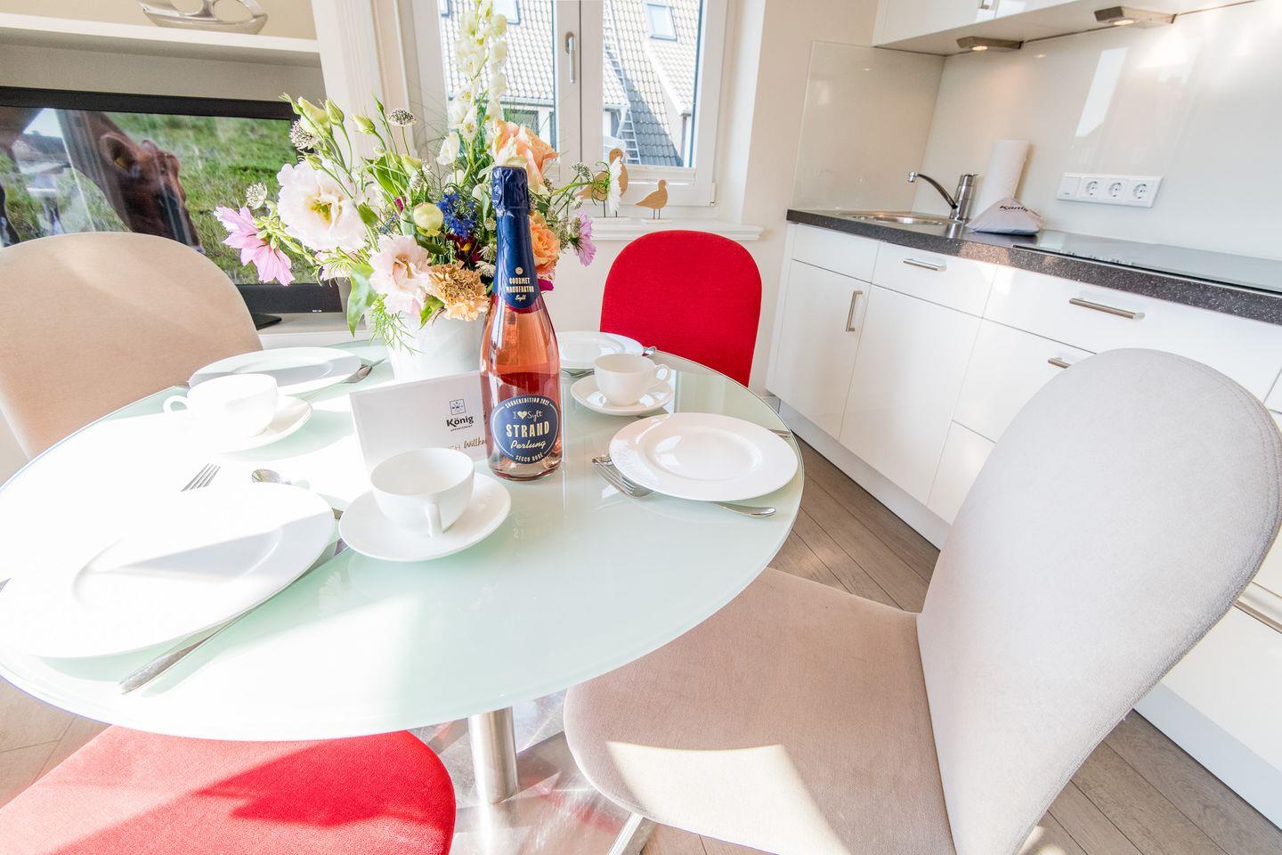 Das gemütliche Wohnzimmer ist mit einem Sofa, einem Sessel, einem Esstisch für 4 Personen und einem TV ausgestattet. Von hier aus gelangen Sie direkt auf den möblierten Balkon nach Westen, auf dem Sie sonnige Stunden und die frische Nordseeluft genießen können.